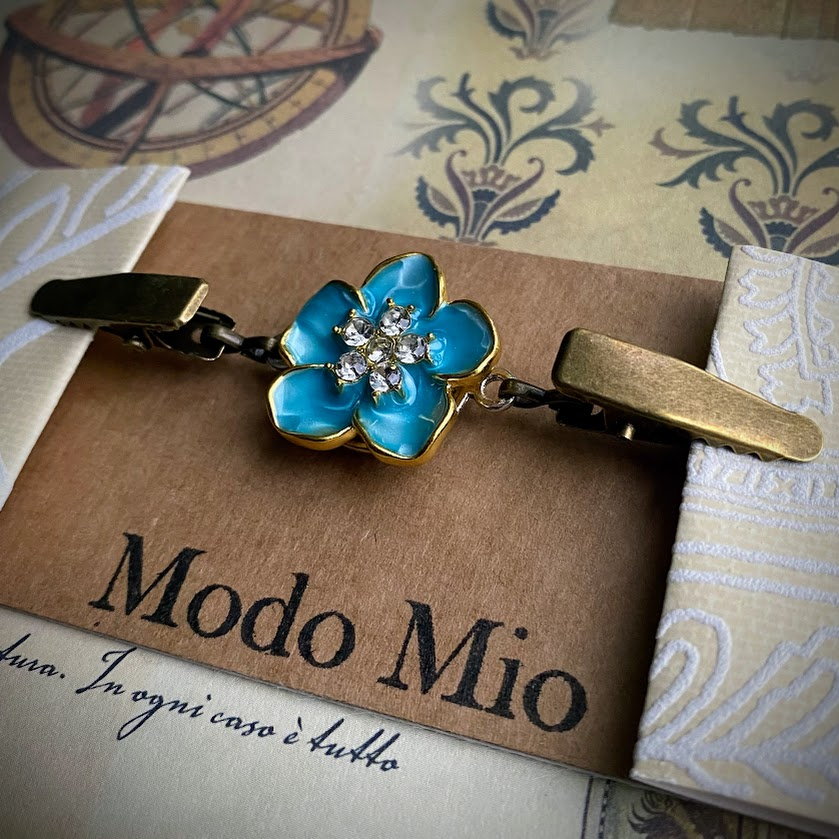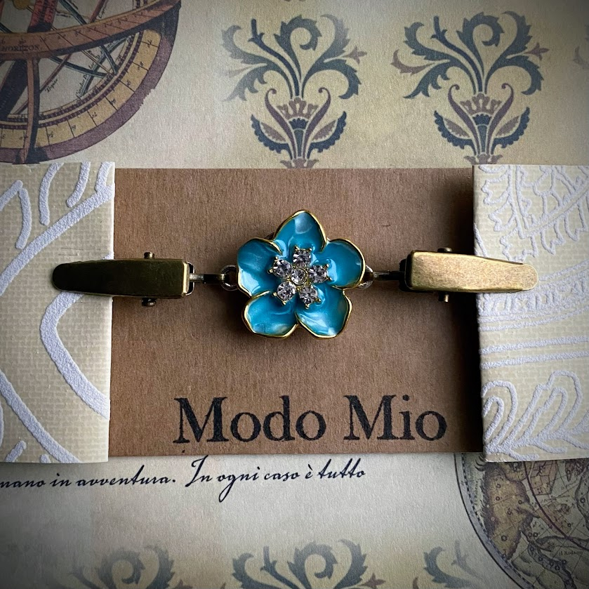 Tämä klipsi on koristeltu kauniilla, emaloidulla kukalla. Kukka puolestaan on viimeistelty pikkuisilla kristalleilla.