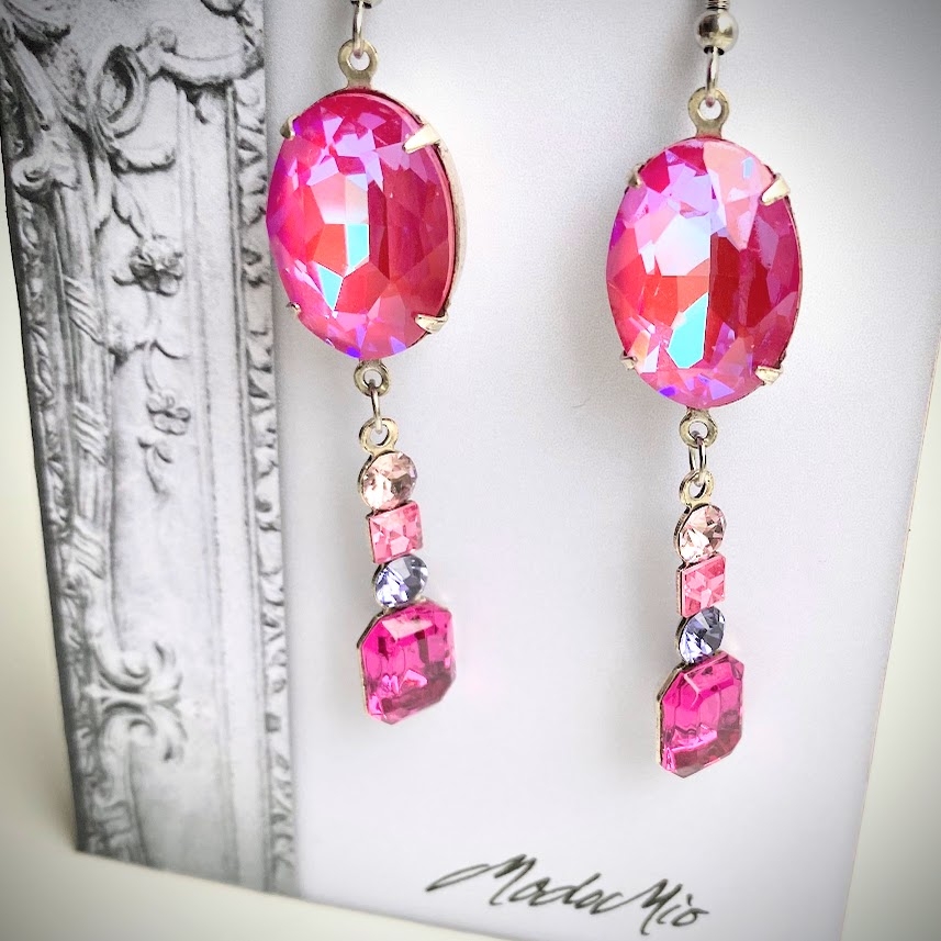 Taidokkaasti hiottu lasisoikio on upotettu hopeoituun kehykseen. Korvakorut viimeistelee upea, upotetuin kristallein koristeltu riipus.
