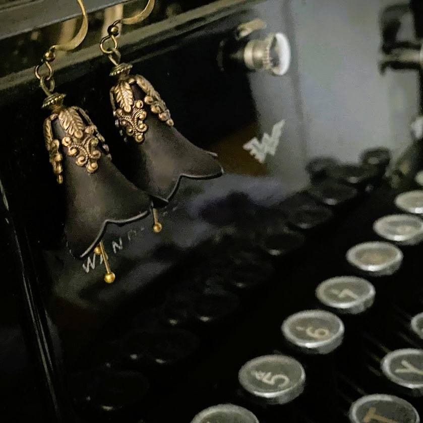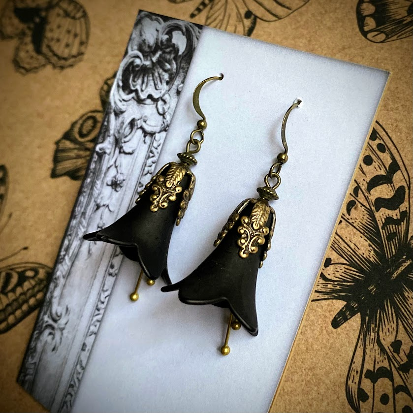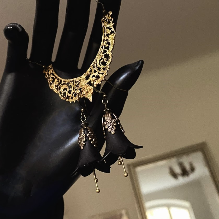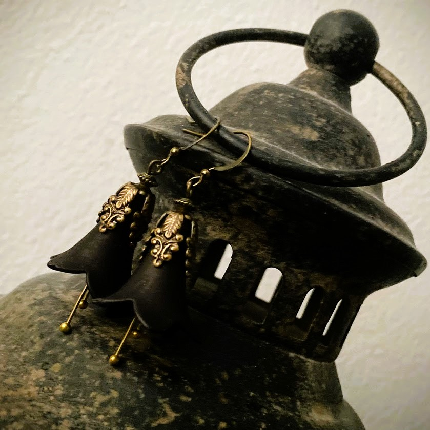 Kauniisti muotoillut, mustat kellokukat (tehty hartsista) on viimeistelty antiikkimessinginvärisillä yksityiskohdilla.