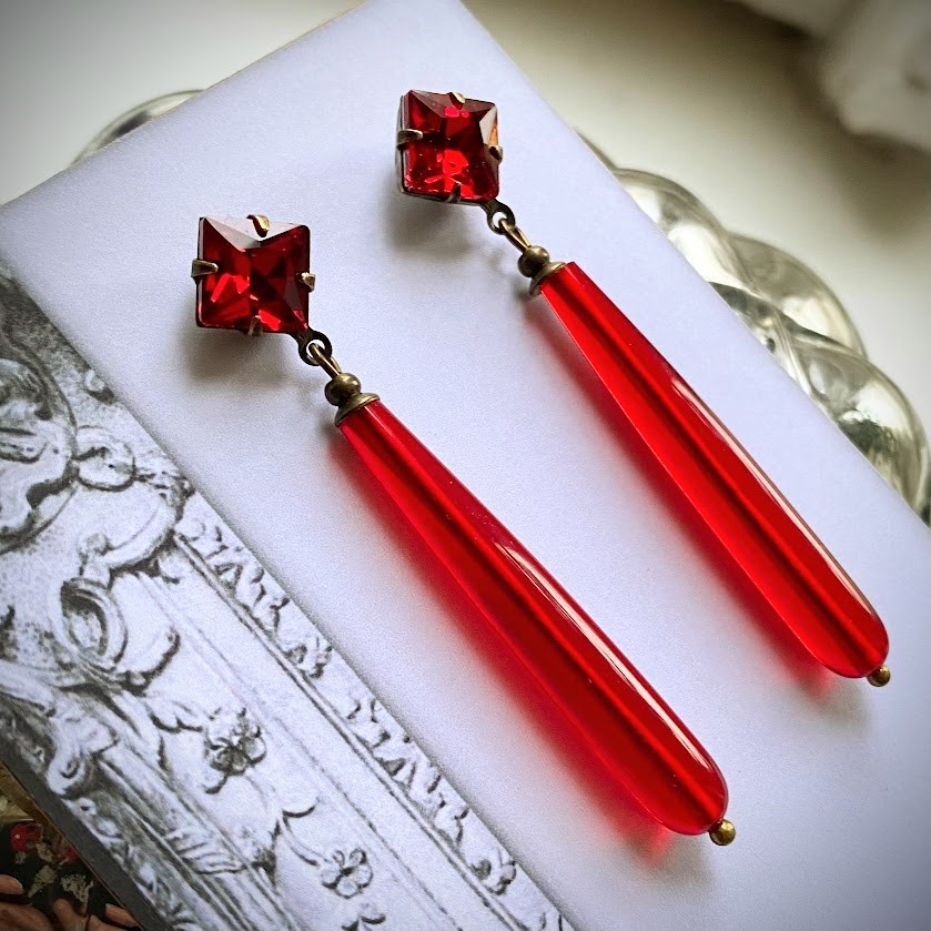 Viehättävät granaattikvartsipisarat on viimeistelty antiikkimessinginvärisillä yksityiskohdilla. Pisaroita kannattelevat taidokkaasti hiotut, punaiset vinoneliöt. Valo leikittelee kauniilla tavalla syvänpunaisissa, eleganteissa korvakoruissa.