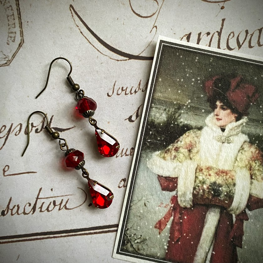 Taidokkaasti hiotut lasihelmet kannattelevat syvänpunaisia, antiikkimessinginvärisiin kehyksiin upotettuja pisaroita. Nämä lämpimän sävyiset korvkorut liikkuvat naisellisesti.