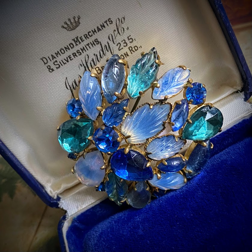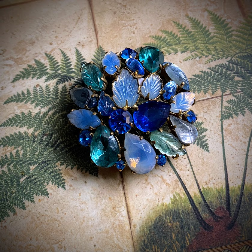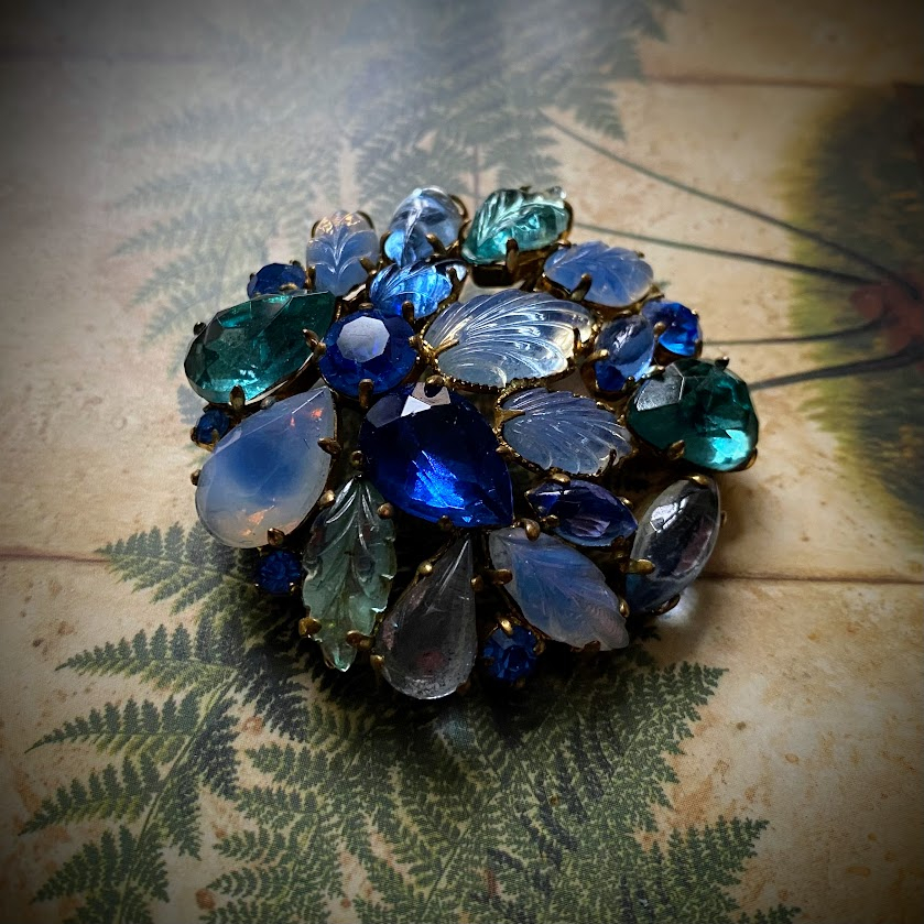 Tämä kaunis rintakoru on peräisin 1950-luvulta. Se heijastelee valoa veden sävyissä salaperäisellä tavalla.