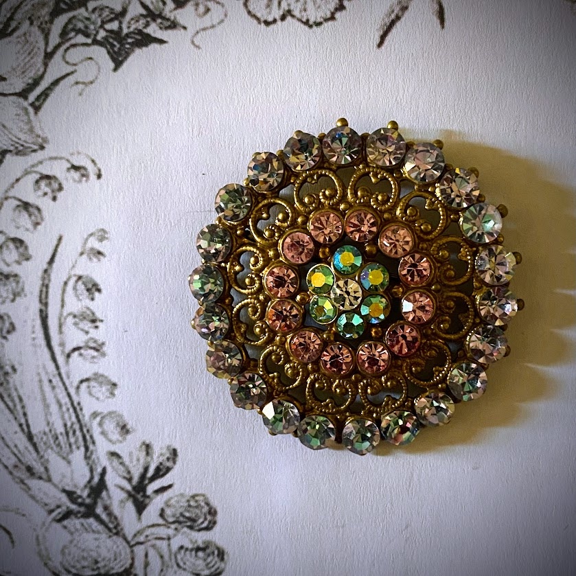 Tämä kaunis, lukuisin upotetuin kristallein koristeltu heleänvärinen rintakoru on peräisin 1930-luvulta.
