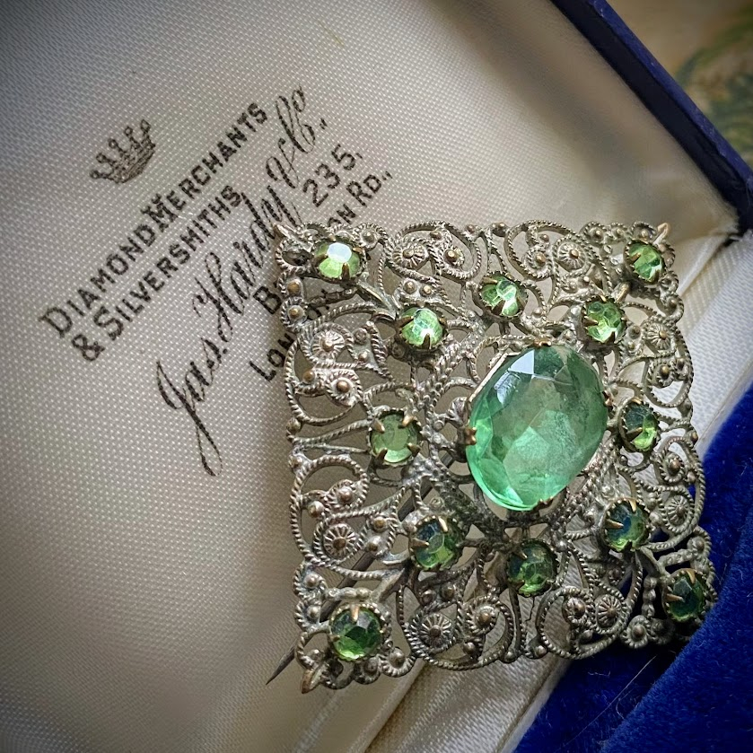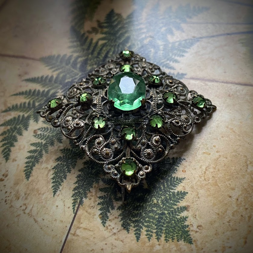 Tämä kaunis rintakoru on peräisin 1930-luvulta. Se heijastelee valoa vihreän sävyissä.