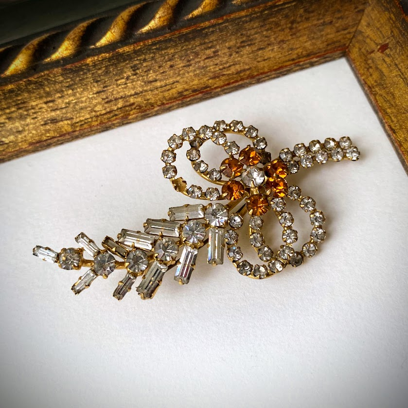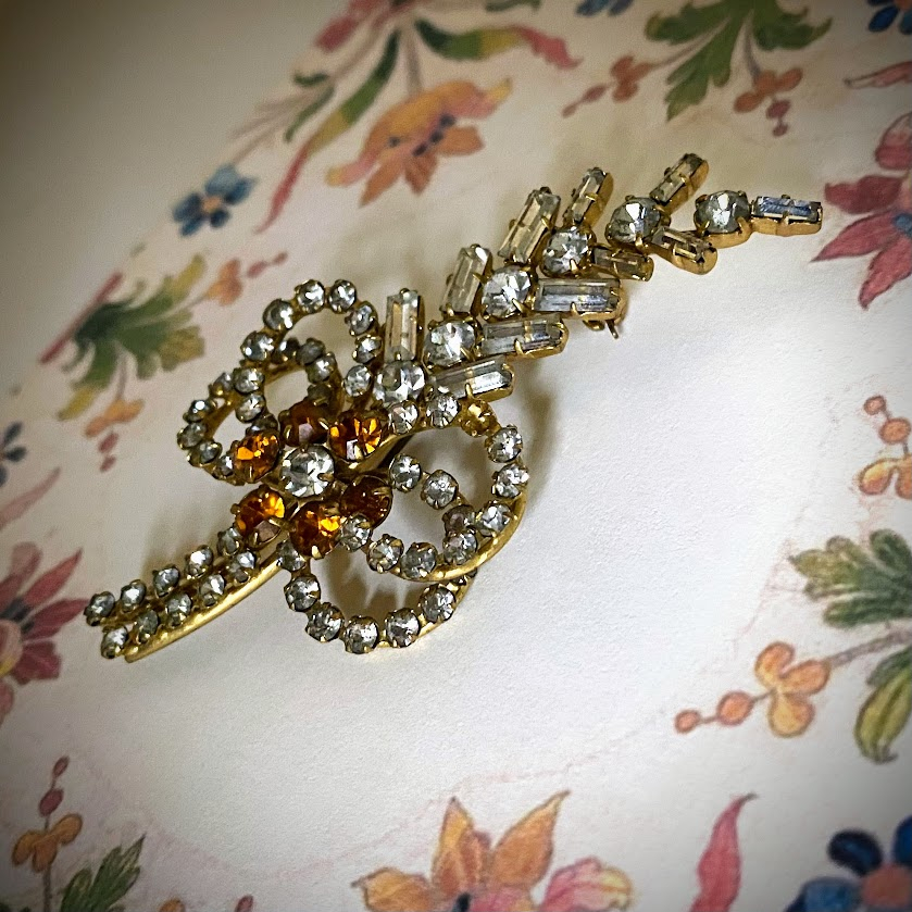 Kauniisti muotoiltu rintakoru on peräisin 50-luvulta. Yksi pieni kristalli puuttuu, se on huomioitu hinnassa.