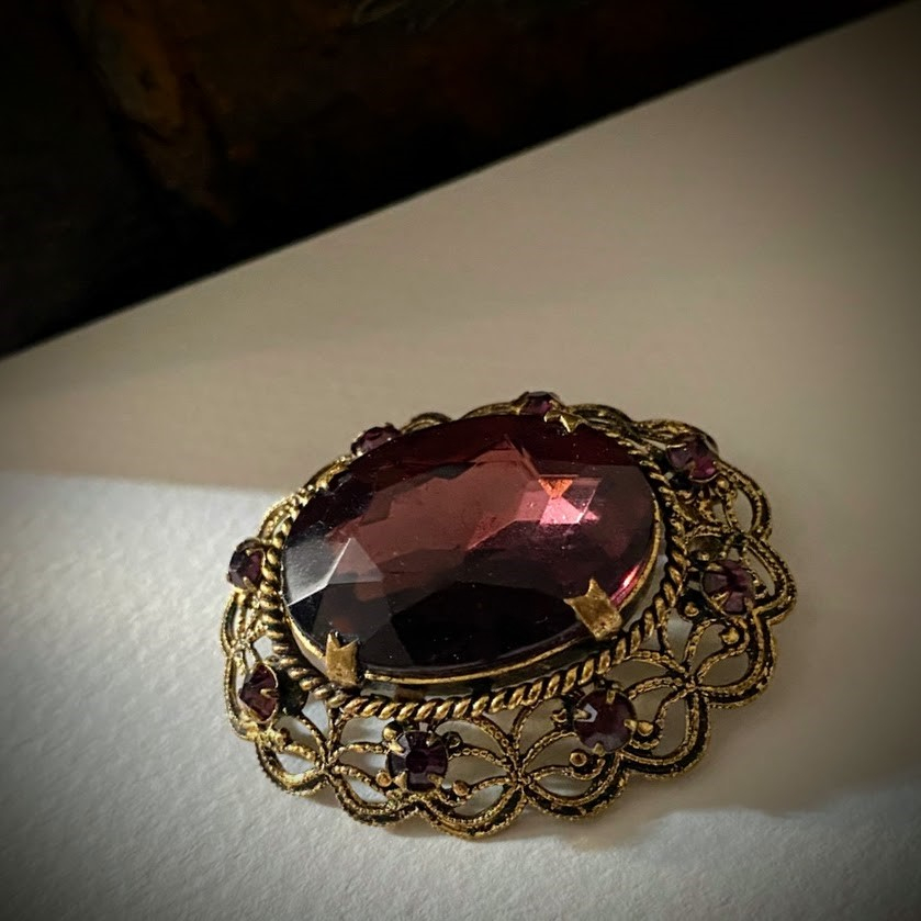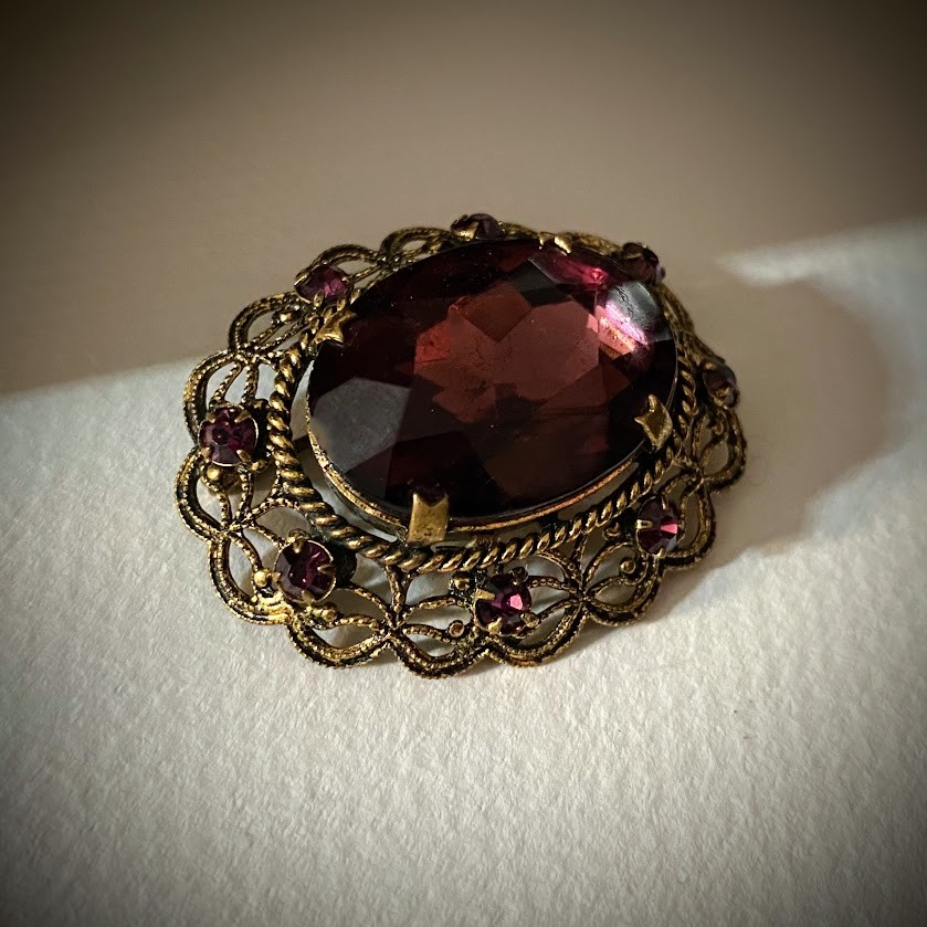 Kauniisti hiotulla, viininpunaisella soikiolla ja pienllä samansävyisillä kristalleilla koristeltu rintakoru on peräisin 50-luvulta.