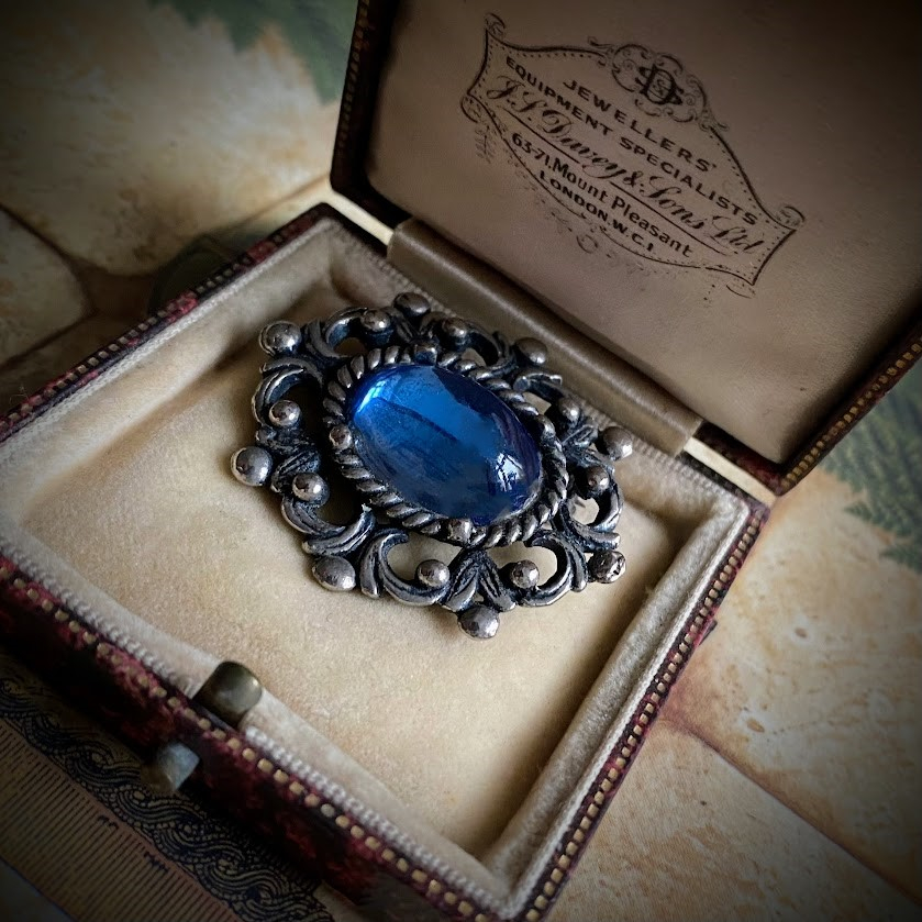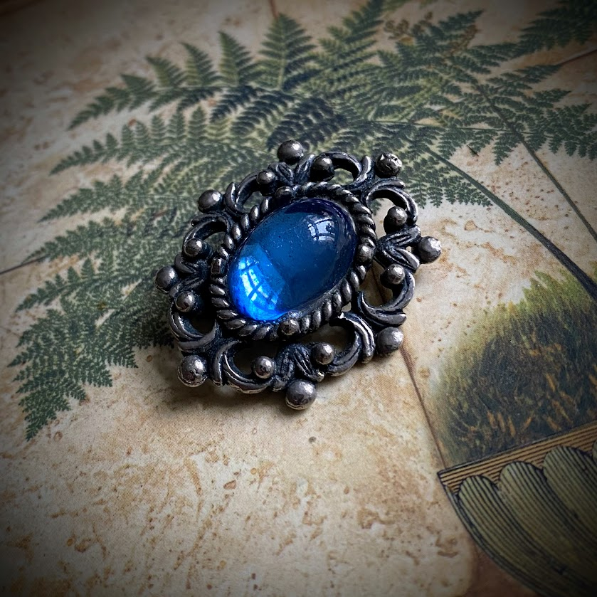 Tätä viehättävää rintakorua koristaa kauniisti valoa heijasteleva sininen soikio.
