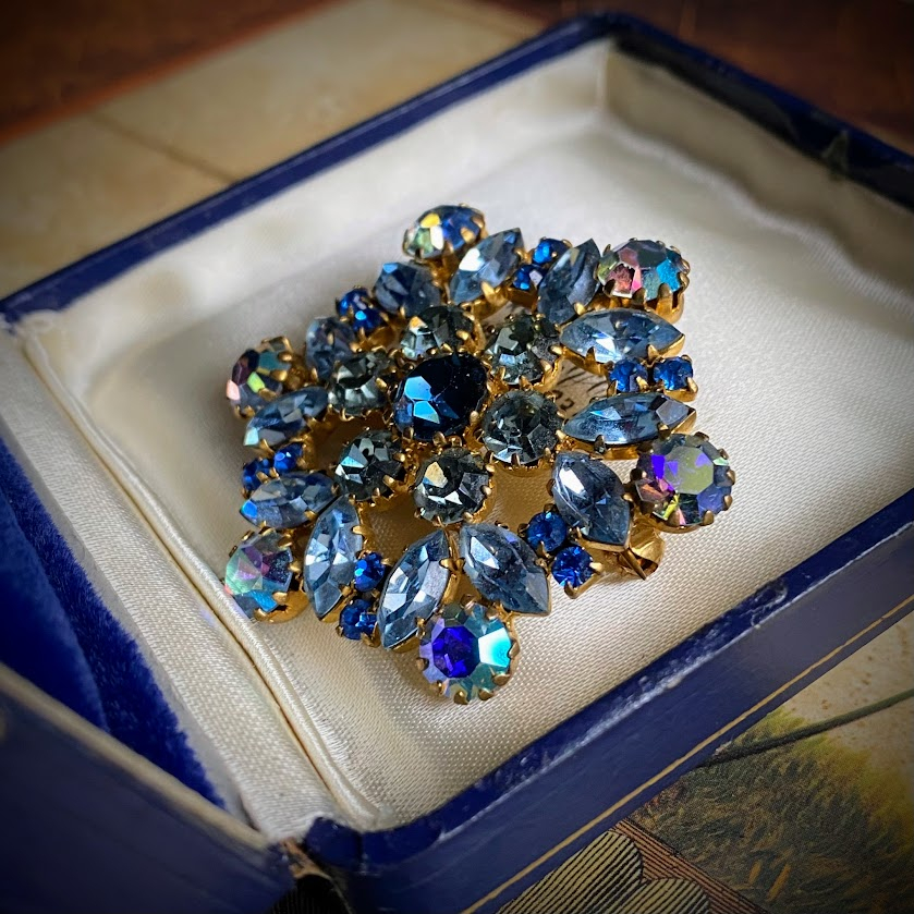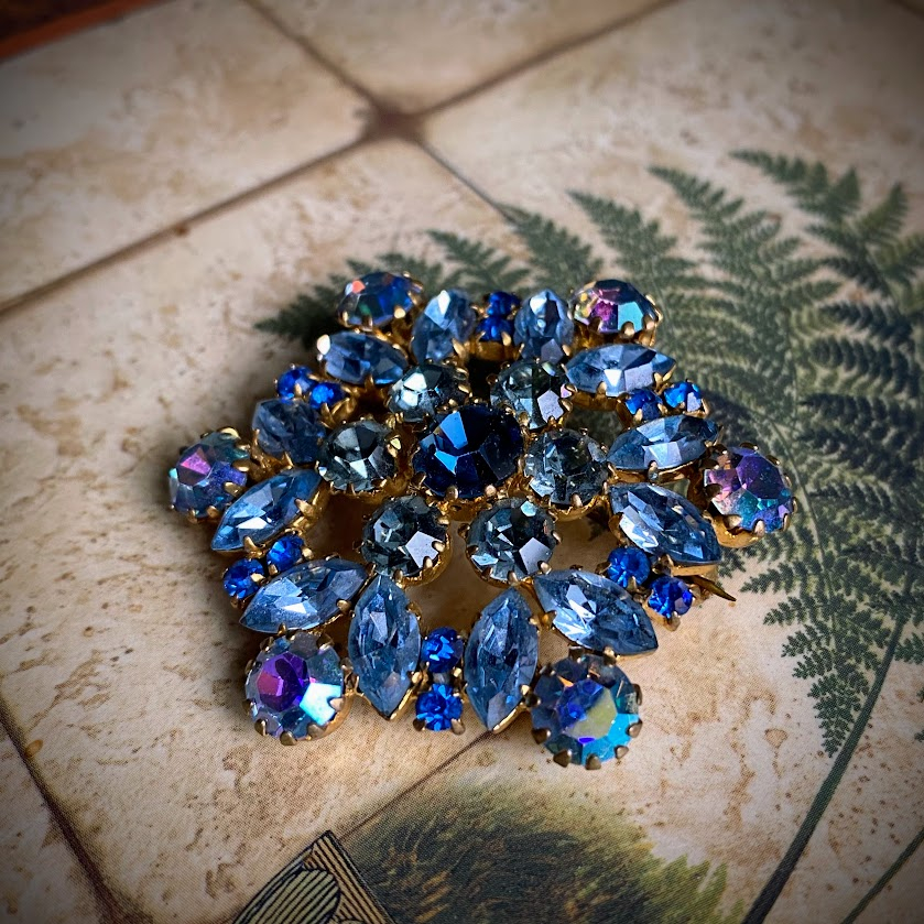 Tämä viehättävä rintakoru on peräisin 1950-luvulta. Valo leikittelee kauniisti sinisävyisissä kristalleissa.