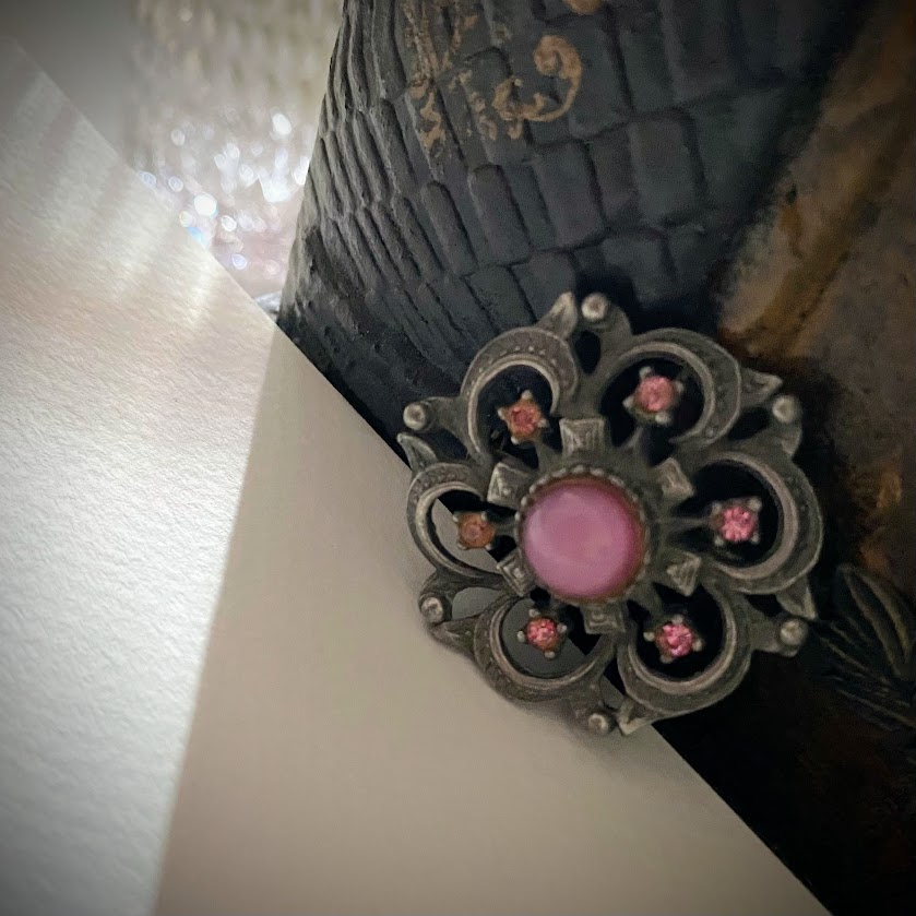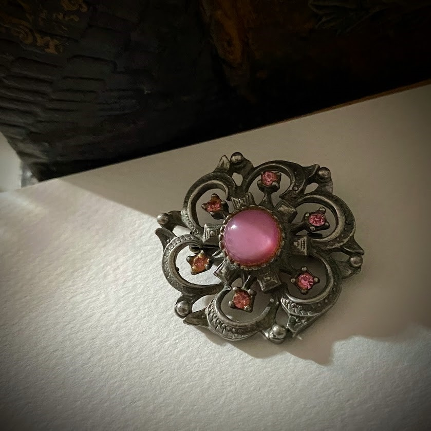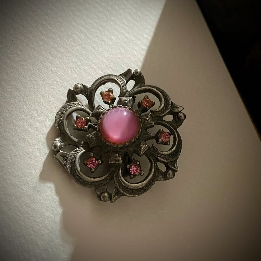 Kauniisti muotoiltu, vaaleanpunaisin kivin koristeltu rintaneula on peräisin 50-luvulta.