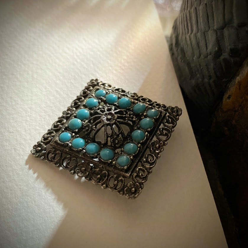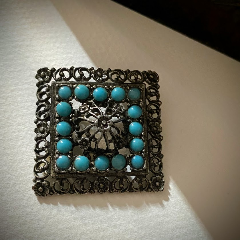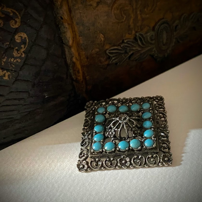 Tätä upeaa vintagerintaneulaa koristavat lukuisat viehättävät ornamentit ja turkoosit detaljit.