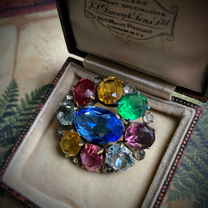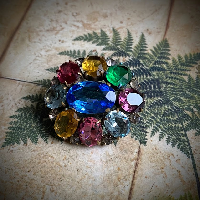 Tämä viehättävä rintakoru on peräisin 1950-luvulta. Valo leikittelee kauniisti erivärisissä, kauniisti hiotuissa detaljeissa.