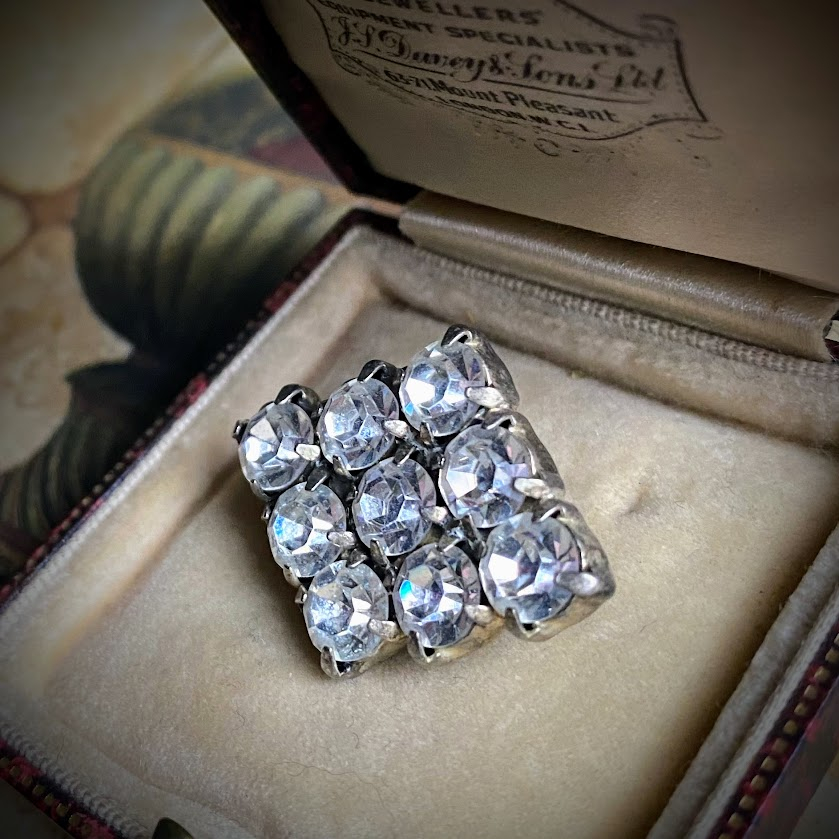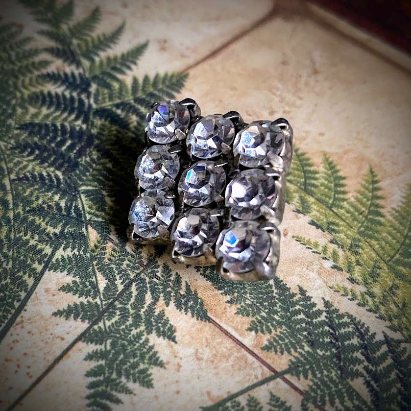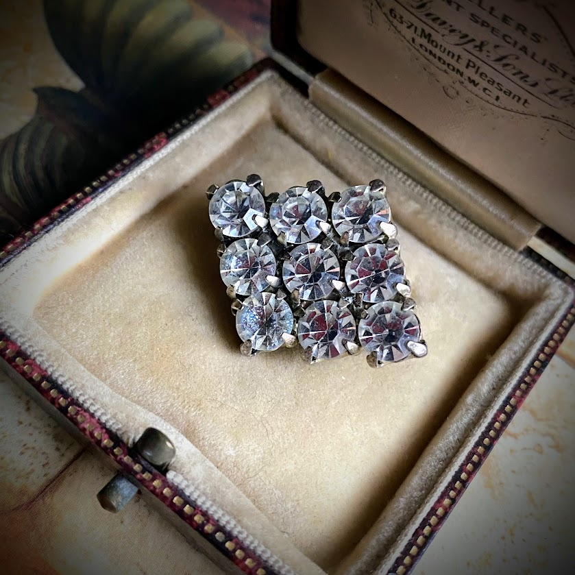 Tämä viehättävä rintakoru on peräisin 1950-luvulta. Valo leikittelee kauniisti kirkkaissa kristalleissa.