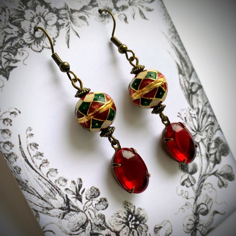 Nämä korvakorut on tehty emaloiduista helmistä, jotka ovat peräisin 50-luvulta, sekä punaisista vintagelasiriipuksista.
