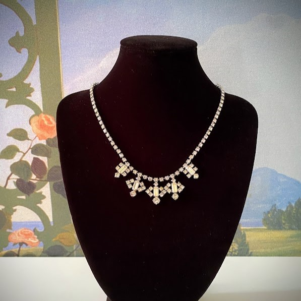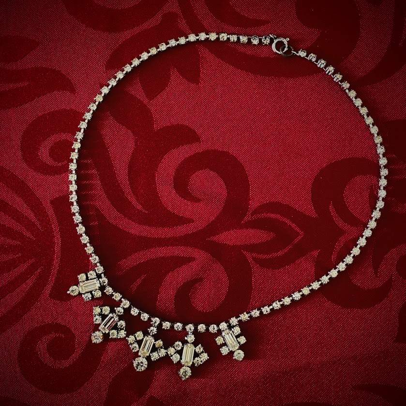 Tämä kauniisti muotoiltu kaulakoru on peräisin 50-luvulta. Se on koristeltu upotetuin kristallein ja on iästään huolimatta hyvässä kunnossa.
