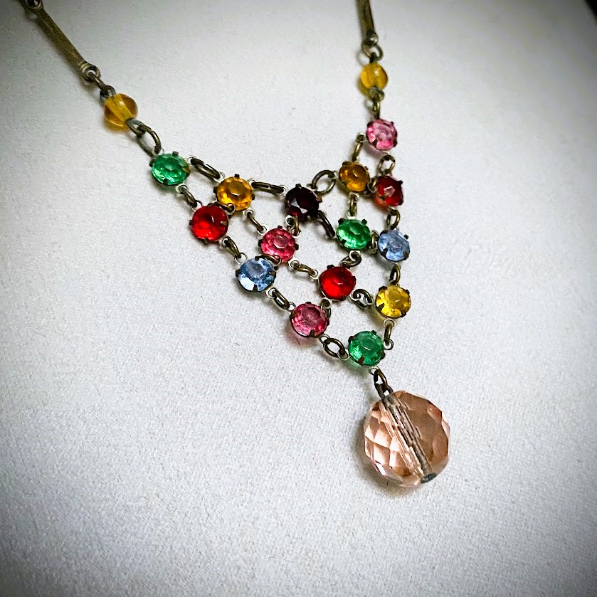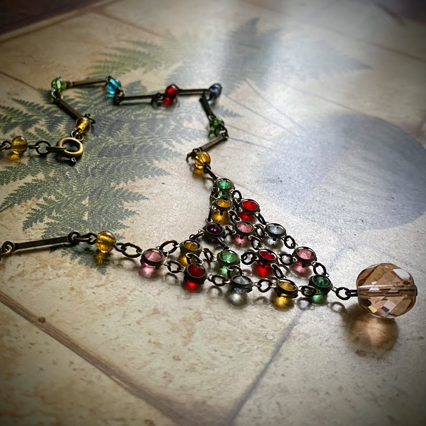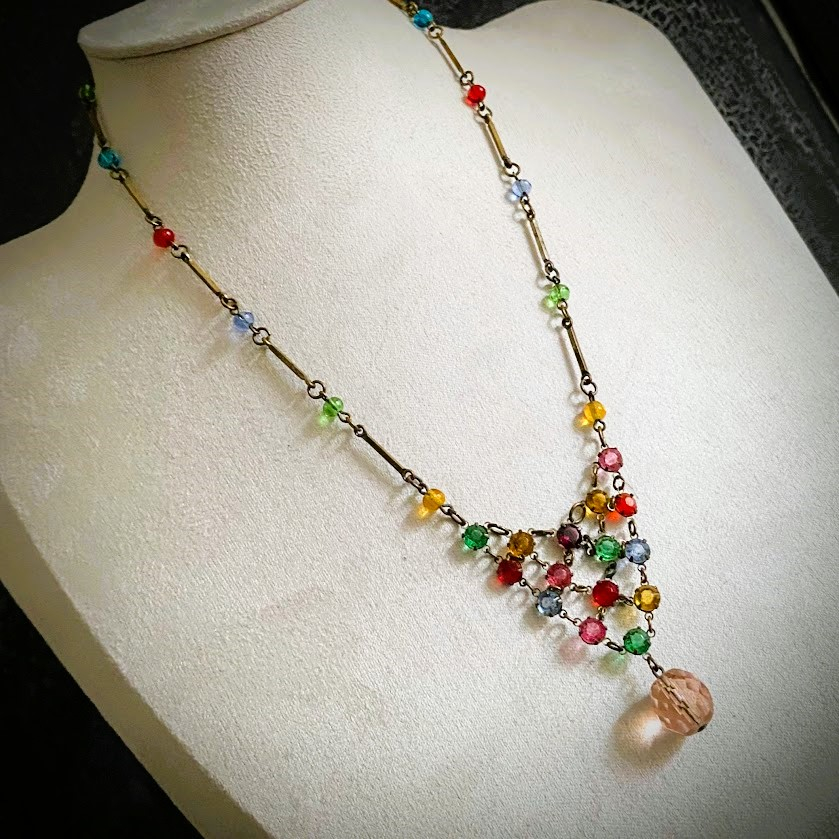 Tämä kauniisti valoa taittava, lukuisin erivärisin helmin koristeltu kaulakoru on peräisin 1950-luvulta. Se on hyvässä kunnossa.