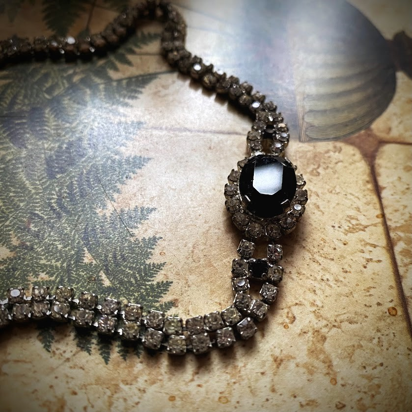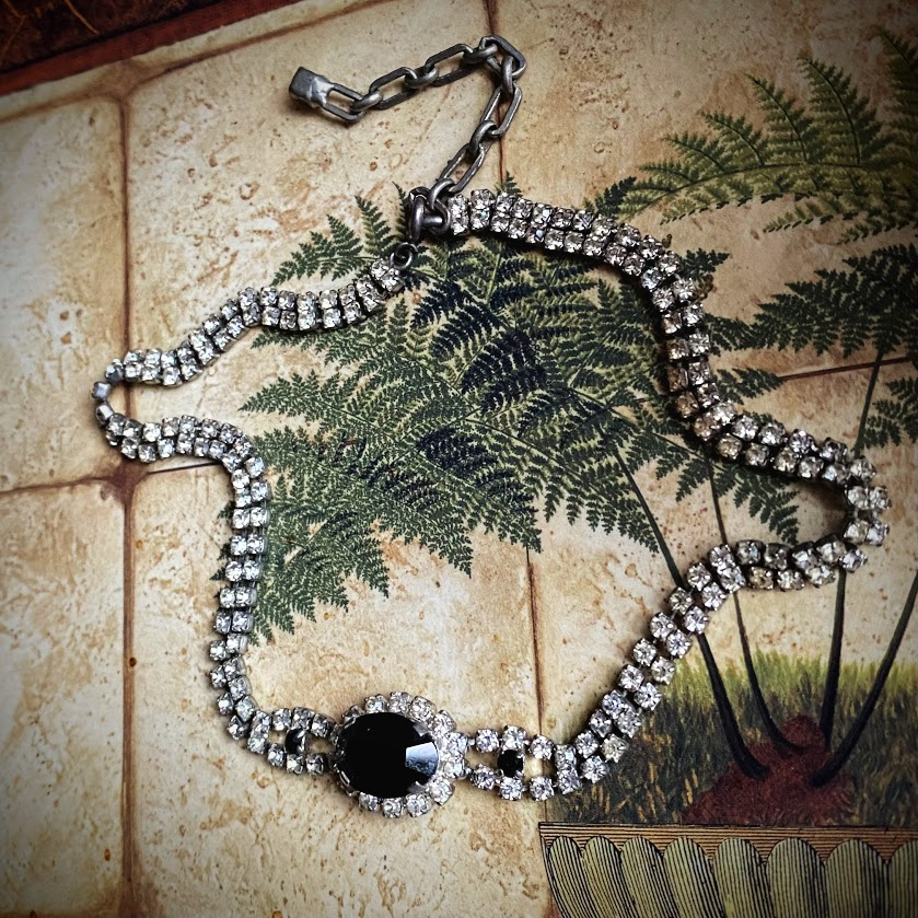Tämä kaunis. choker-kaulakoru on koristeltu mustilla lasidetaljeilla ja lukuisilla kristalleilla. Se on peräisin 1950-luvulta ja se on on hyvässä kunnossa.