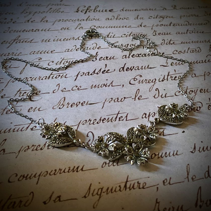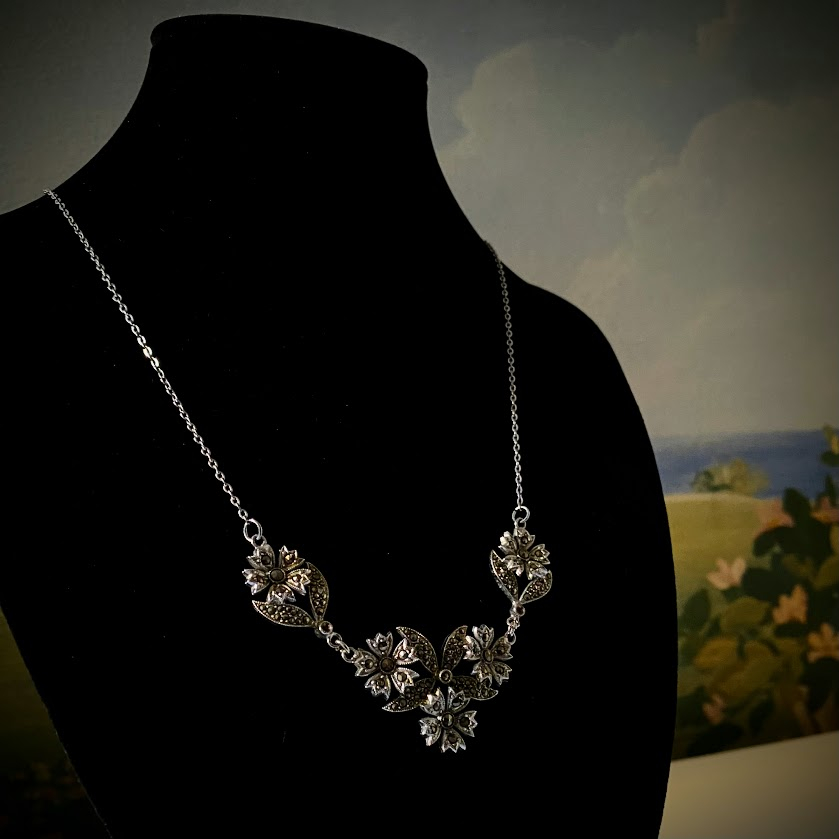 Tämä upea, kukka-aiheinen kaulakoru on koristeltu lukuisin, upotetuin markasiitein. Se on hyvässä kunnossa.
