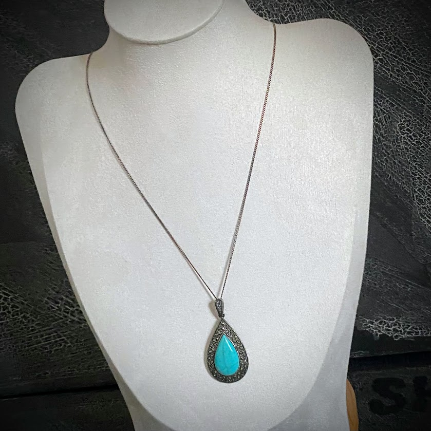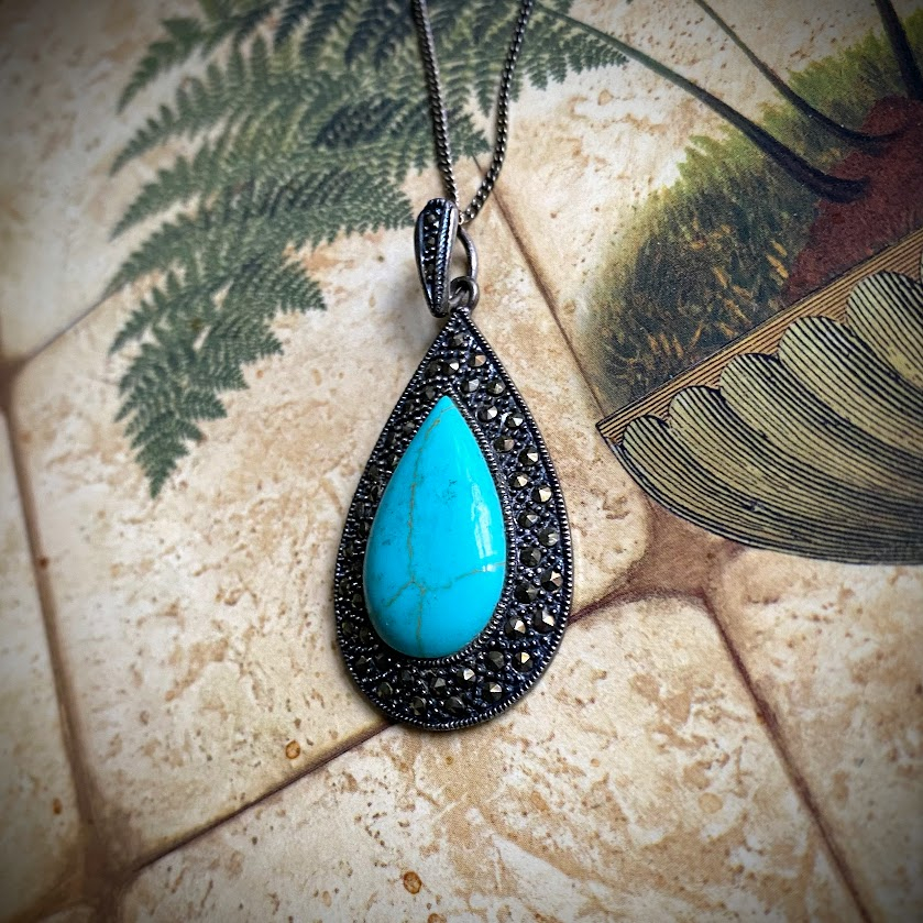 Tämä kauniisti muotoiltu pisarariipus on tehty aidosta turkoosista. Pisaraa ympäröivään hopeakehykseen on upotettu lukuisia markasiitteja. Koru on hyvässä kunnossa.