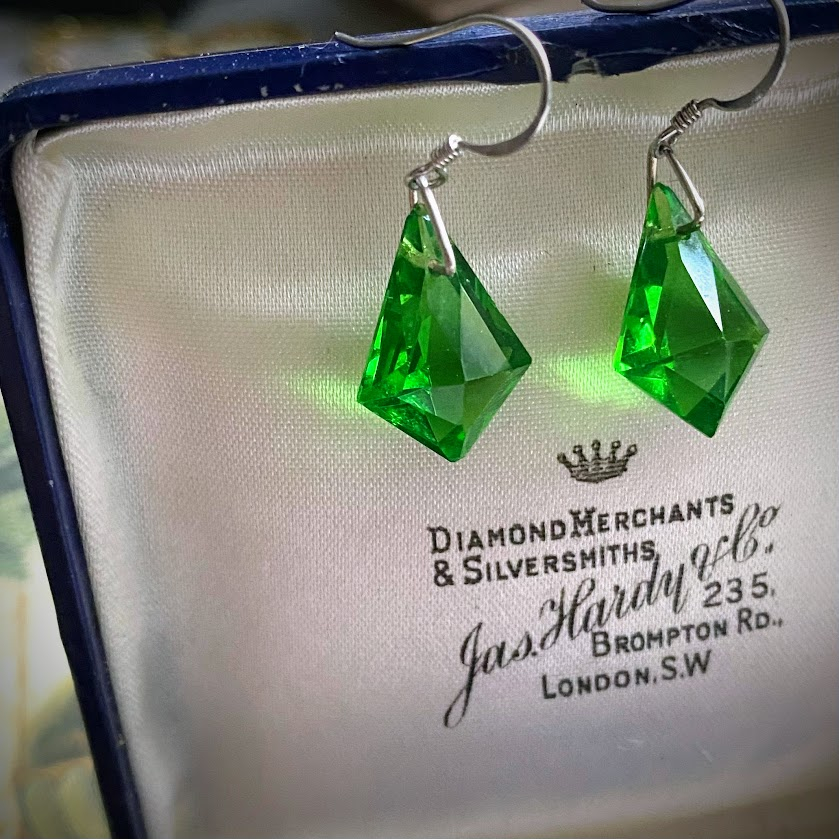 Nämä Art Deco -tyyliset vihreät pisarakorvakorut taittavat valoa hienolla tavalla. Korvakorut on varustettu hopeakoukuilla.