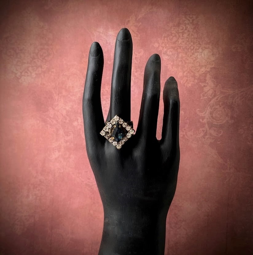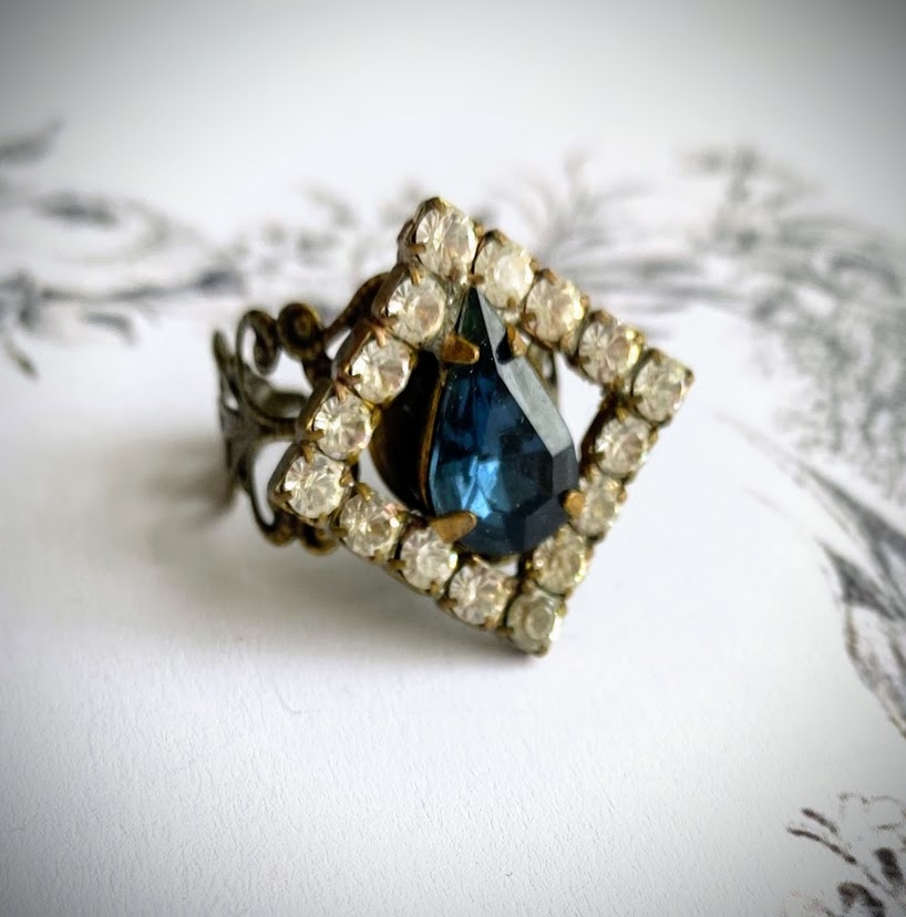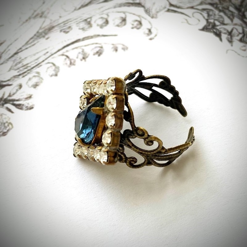 Elizabeth-sarjaan kuuluu aitoja, englantilaisia vintagekoruja, jotka ovat löytyneet lontoolaisten antiikkikauppiaiden valikoimista. Tässä sormuksessa on käytetty 50-luvulta peräisin olevia korvakoruja, joita koristavat tummansiniset pisarat ja lukuisat kristallit.