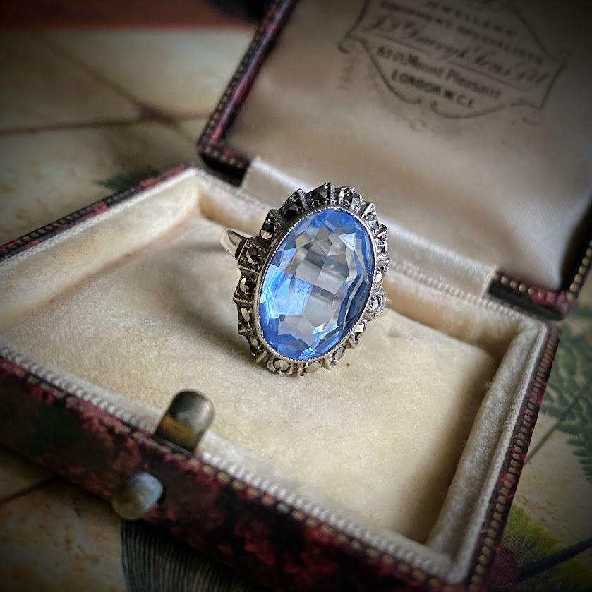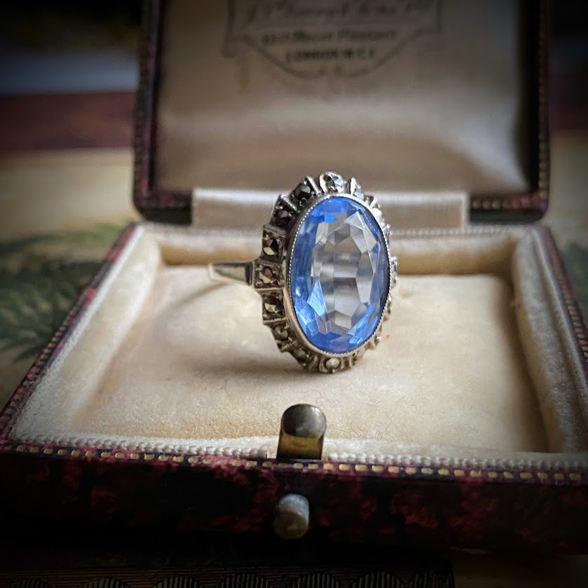 Tätä upeasti hiottua, kauniisti valoa taittavaa topaasia ympäröi hopeakehys, johon on upotettu markasiitteja. Se on hyvässä kunnossa.