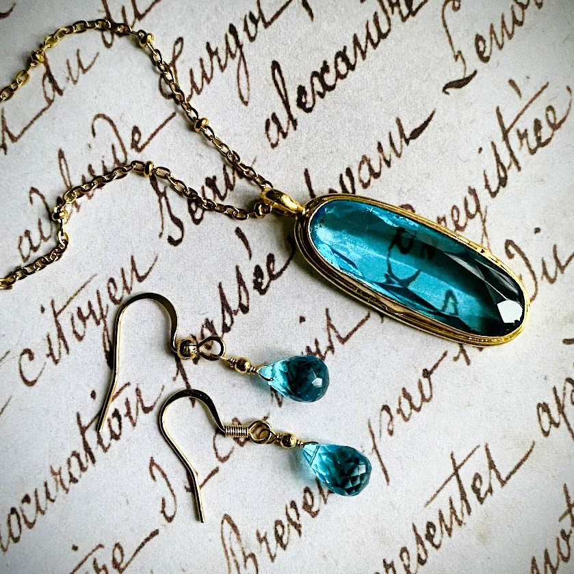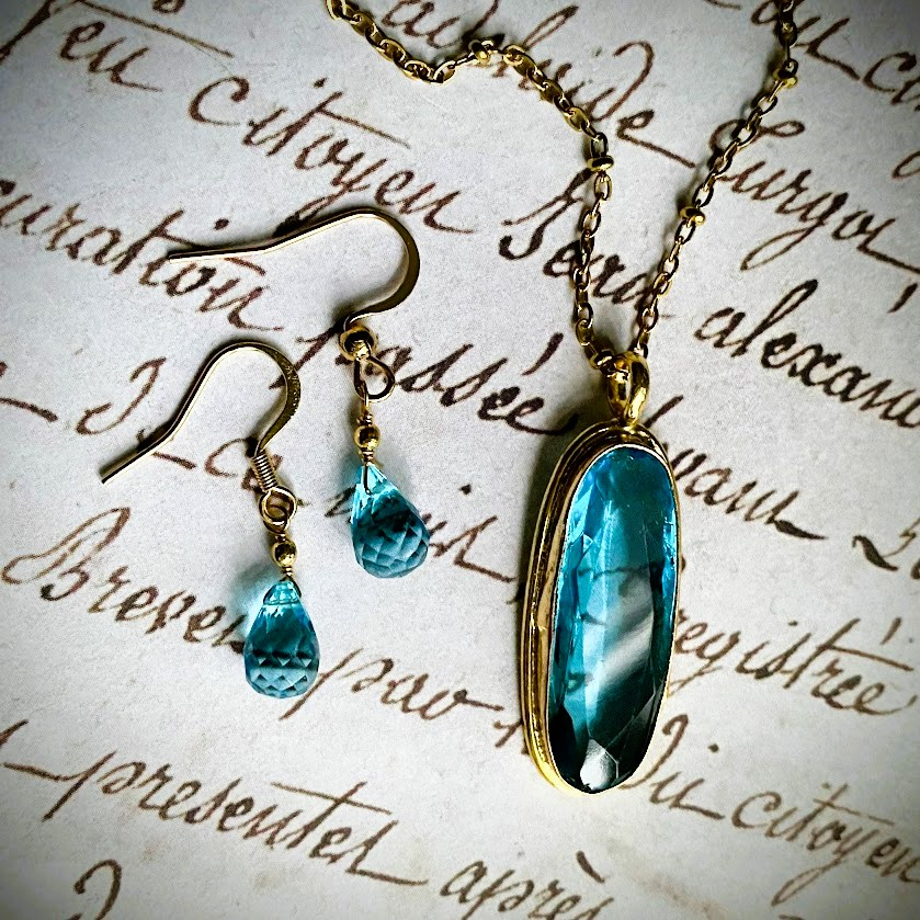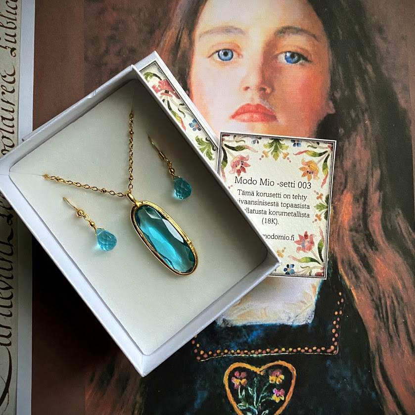 Upeasti hiottu taivaansininen topaasiriipus on upotettu kullattuun kehykseen (18K).