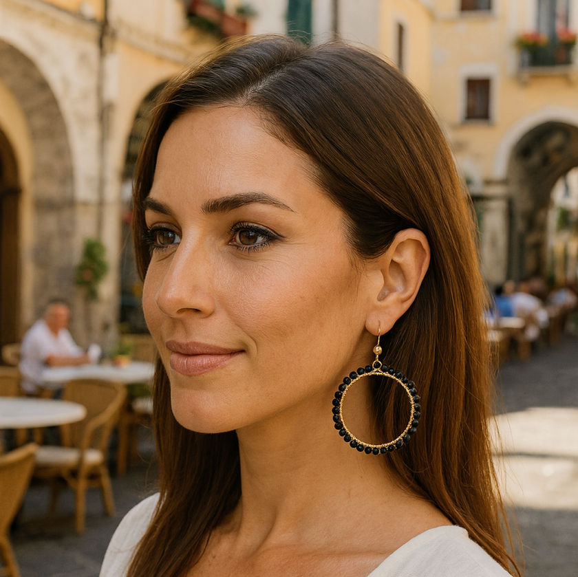 Amalfi II -korvakorut on tehty aidosta, kauniisti hiotusta mustasta onyxista. Metalliosissa on 18 karaatin kultaus. Selkeälinjaiset, keveät korvakorut liikkuvat naisellisesti,