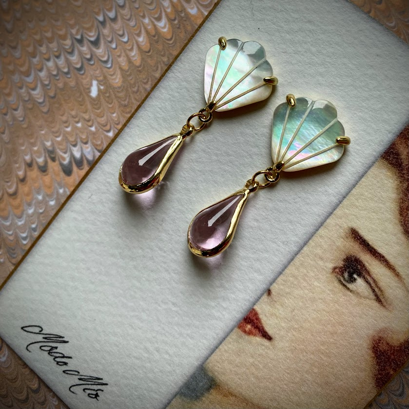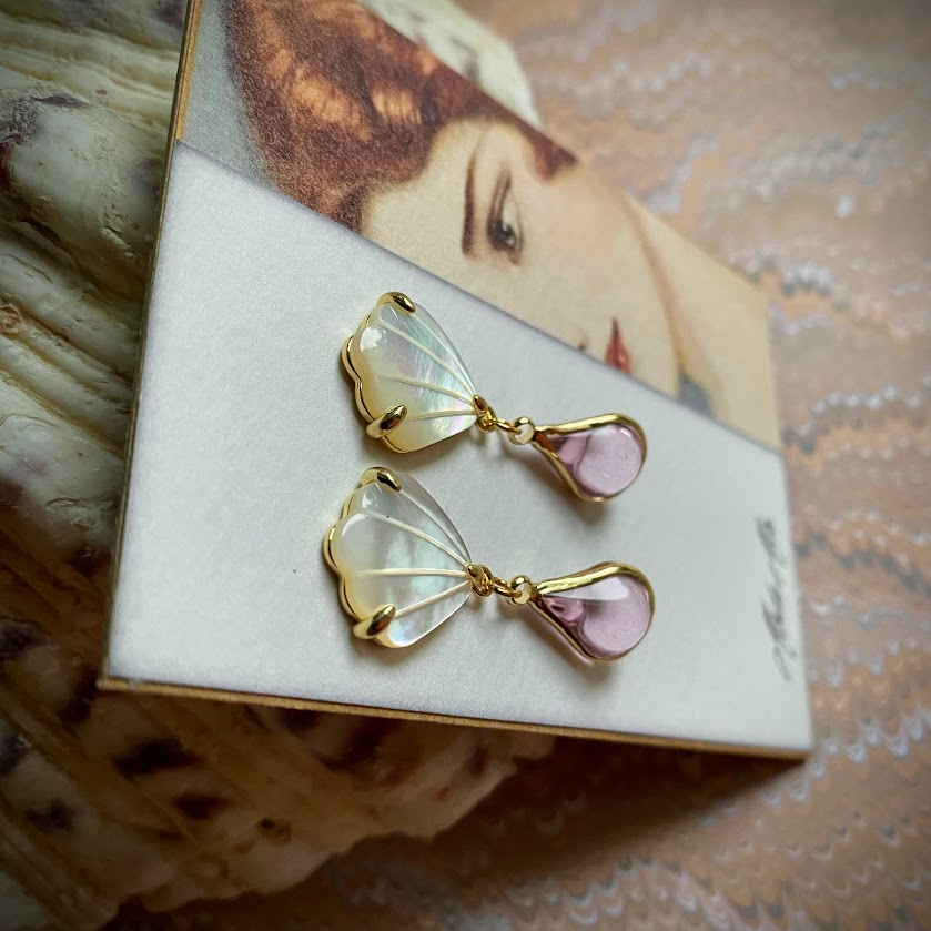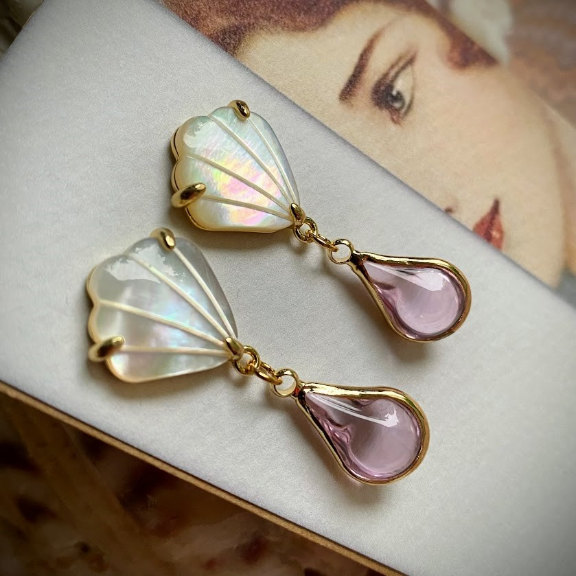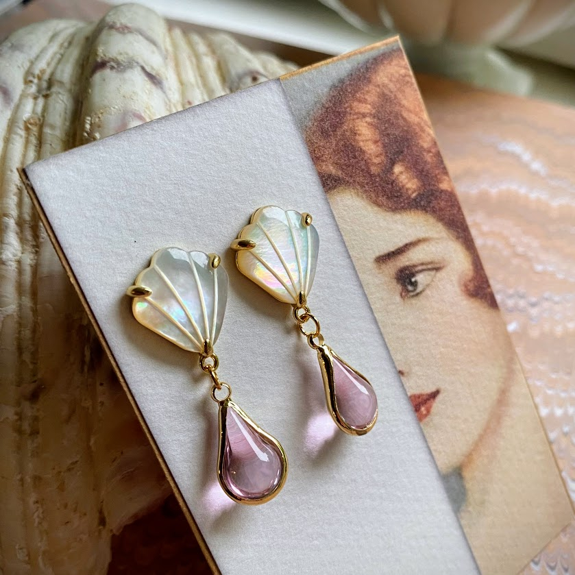Laguna Lux -korvakorut on tehty aidosta helmiäisestä, joka heijastelee kauniisti valoa. Viuhkanmuotoinen, kullattu yläosa kannattelee kaunista, vaaleanpunaista lasipisaraa. Korvakorut liikkuvat naisellisesti,