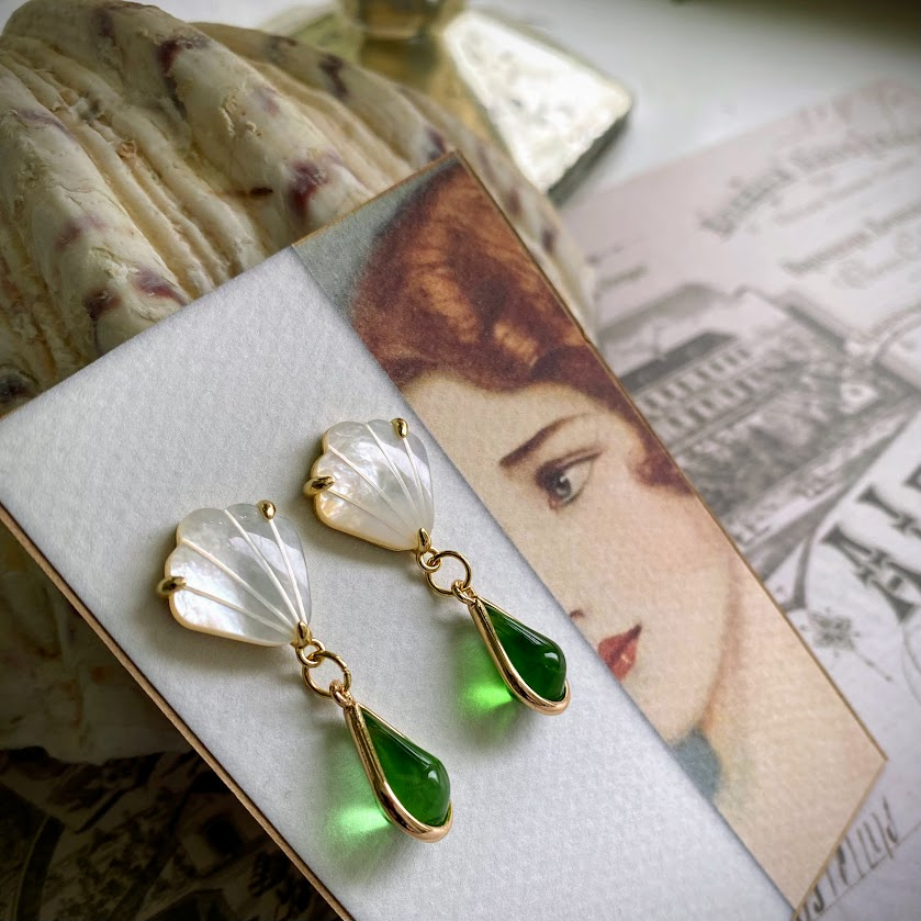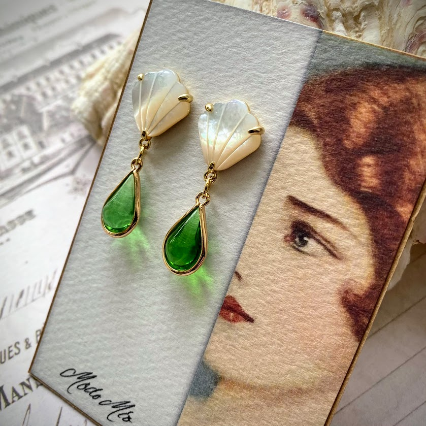 Laguna Lux -korvakorut on tehty aidosta helmiäisestä, joka heijastelee kauniisti valoa. Viuhkanmuotoinen, kullattu yläosa kannattelee kaunista, vihreää lasipisaraa. Korvakorut liikkuvat naisellisesti,