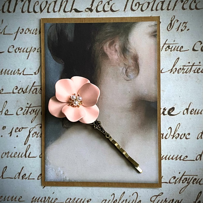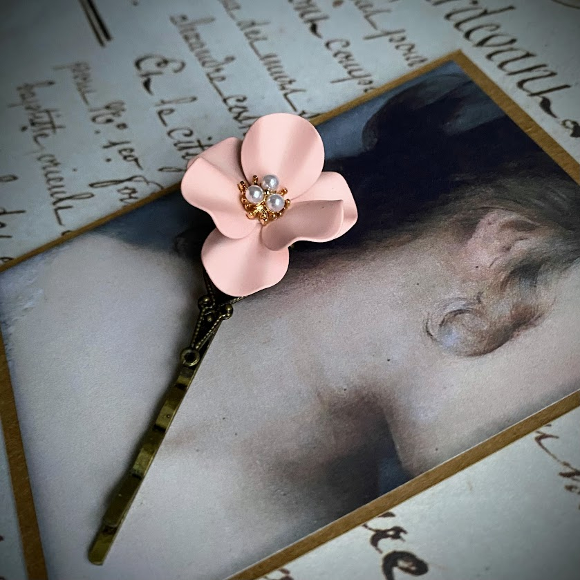 Antiikkipronssinväristä hiuspinniä koristaa kaunis, vaaleanpunainen/puuterinvärinen kukka, joka on viimeistelty pienillä valkoisilla helmillä.