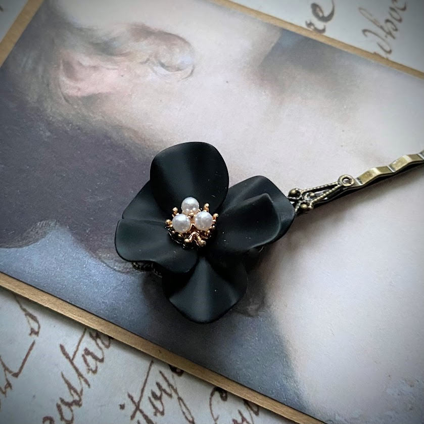 Antiikkipronssinväristä hiuspinniä koristaa kaunis, musta kukka, joka on viimeistelty pienillä valkoisilla helmillä.