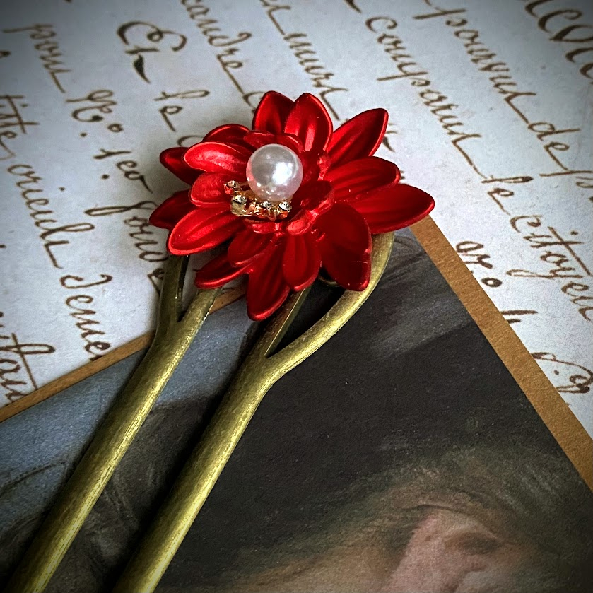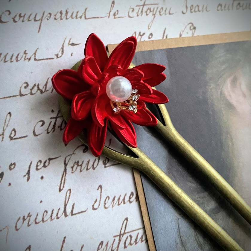 Antiikkimessinginvärisiä hiuspuikkoja koristaa kaunis, punainen kukka, joka on puolestaan viimeistelty valkoisella helmellä ja pikkuisilla kristalleilla.