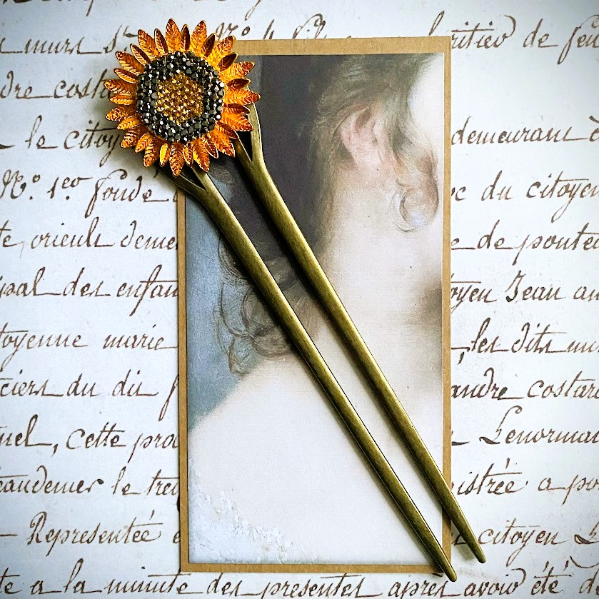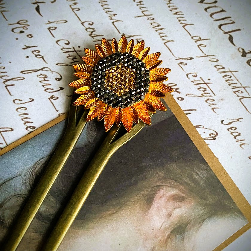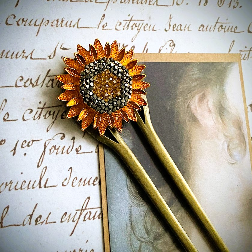 Antiikkimessinginvärisiä hiuspuikkoja koristaa lukuisin pienin kirstallein viimeistelty auringonkukka.
