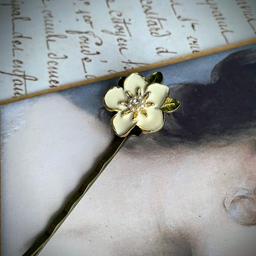 Antiikkipronssinvärinen hiuskoriste on viimeistelty kauniilla, emaloidulla kukalla. Kermanvärisen kukan keskiössä hohtavat pienet helmet ja kristalli.