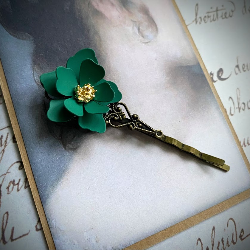Antiikkipronssinvärinen hiuskoriste on viimeistelty kauniilla, vihreällä kukalla, jota koristavat kullanväriset terälehdet.