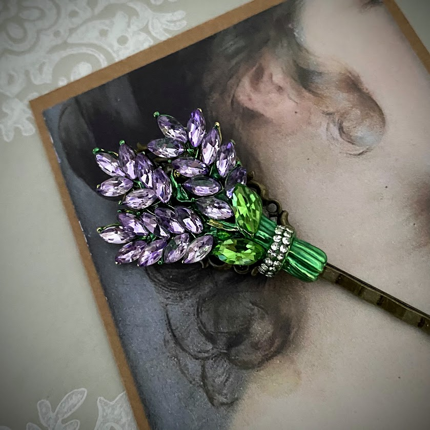 Kauniilla laventelikimpulla varustettu hiuskoriste.