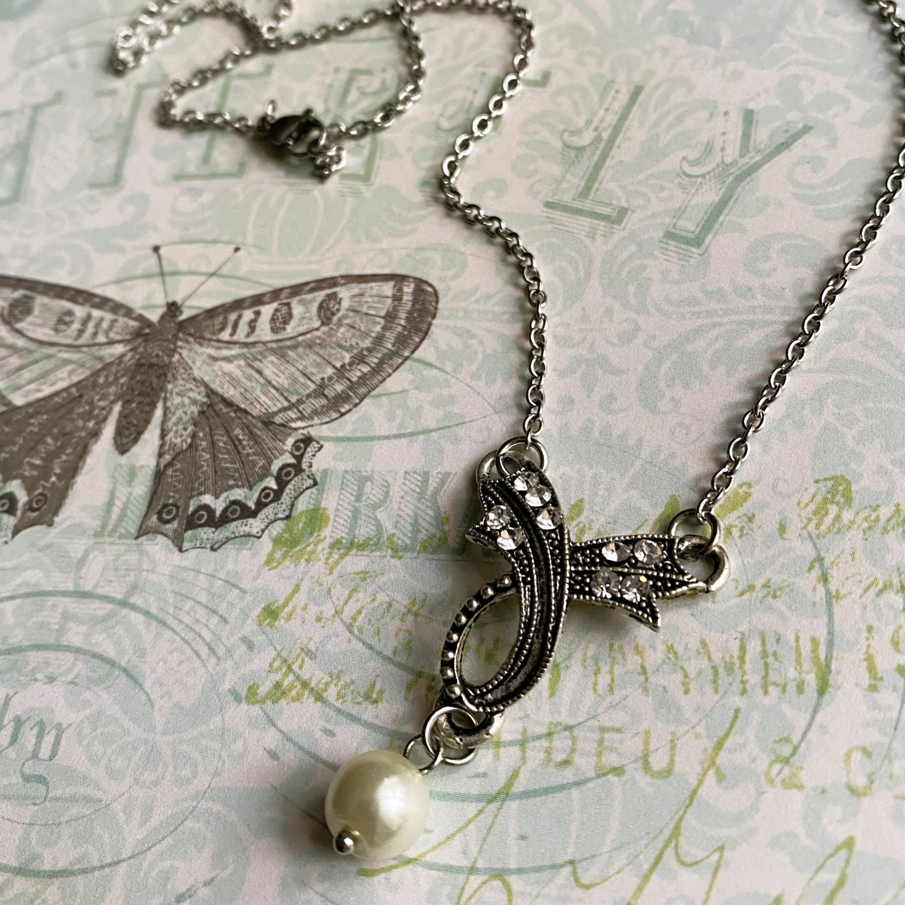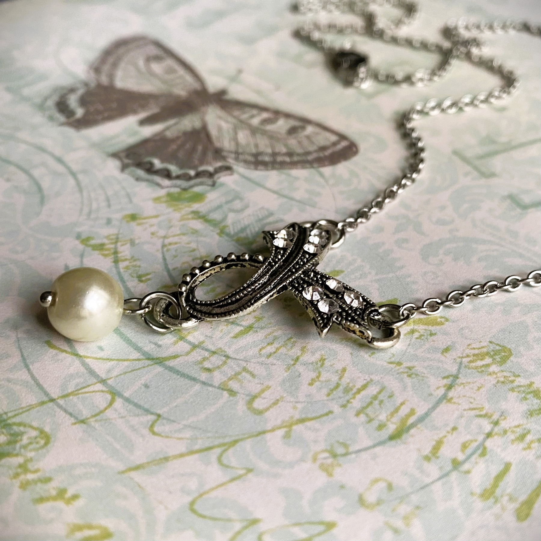 Tämän viehättävän kaulakorun kauneus on ajatonta. Tyylikkääseen, antiikkihopeanväriseen riipusosaan on upotettu strasseja. Helmi lisää koruun hillittyä hohdetta.