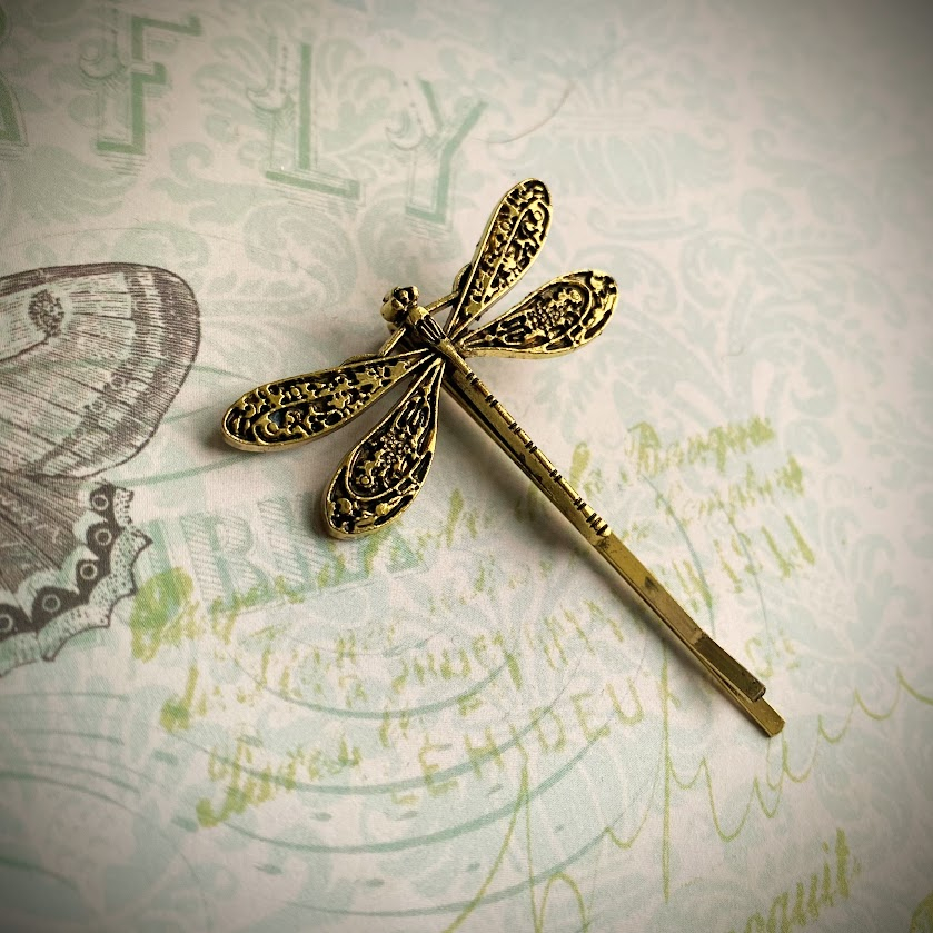 Kauniisti muotoiltu sudenkorento viimeistelee tämän viehättävän hiuskoristeen.