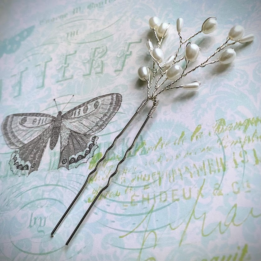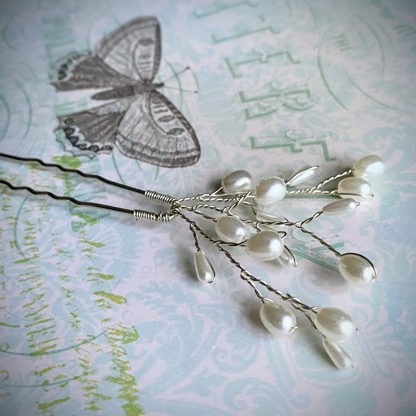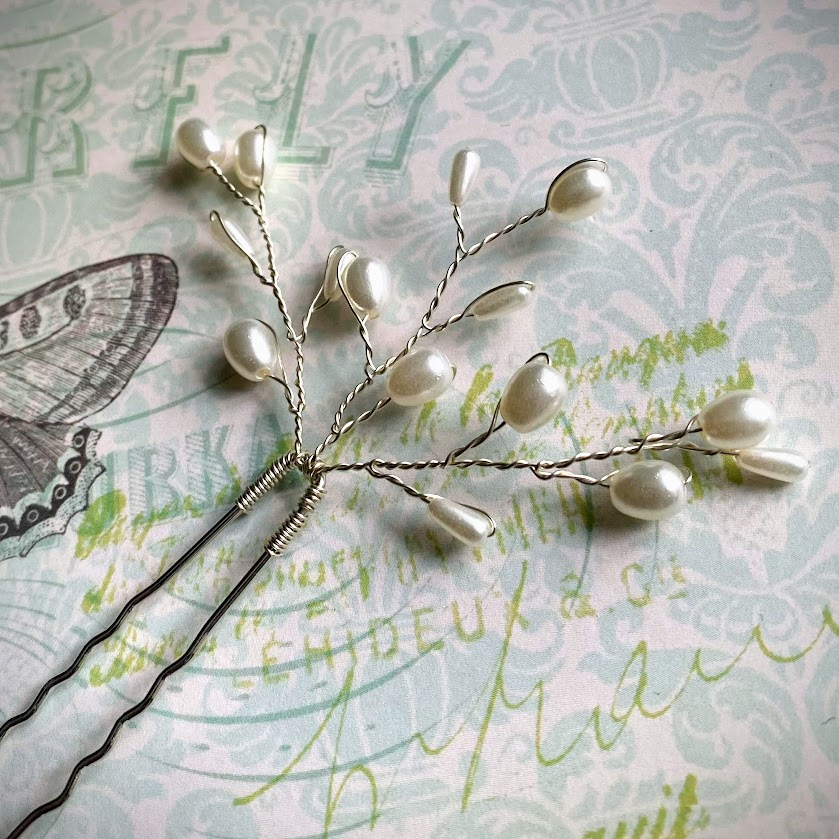 Kauniisti muotoiltu hiuskoriste on viimeistelty hohtavilla helmipisaroilla. Tipuisaa koristetta on helppo muotoilla omien mieltymysten mukaan.