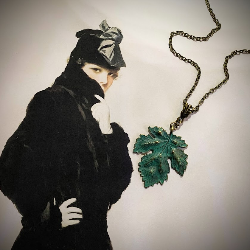 Nikkelittömässä kaulakorussa on viehättävä, patinoitu lehtiriipus.