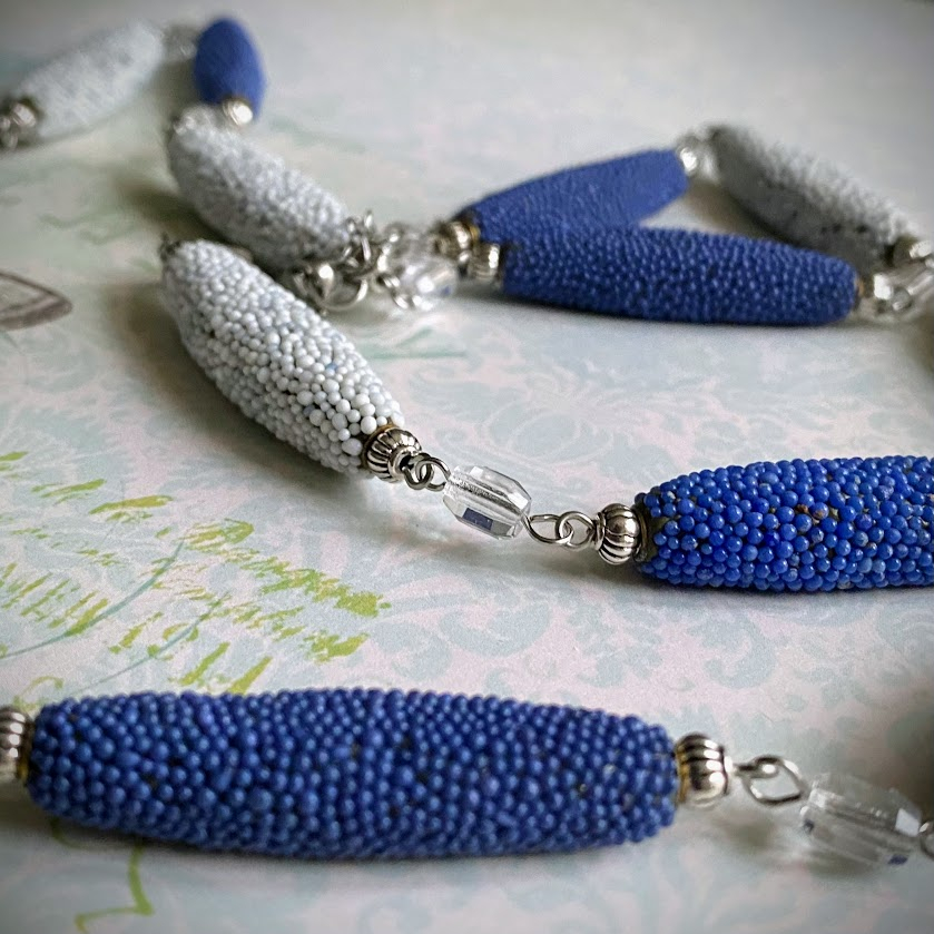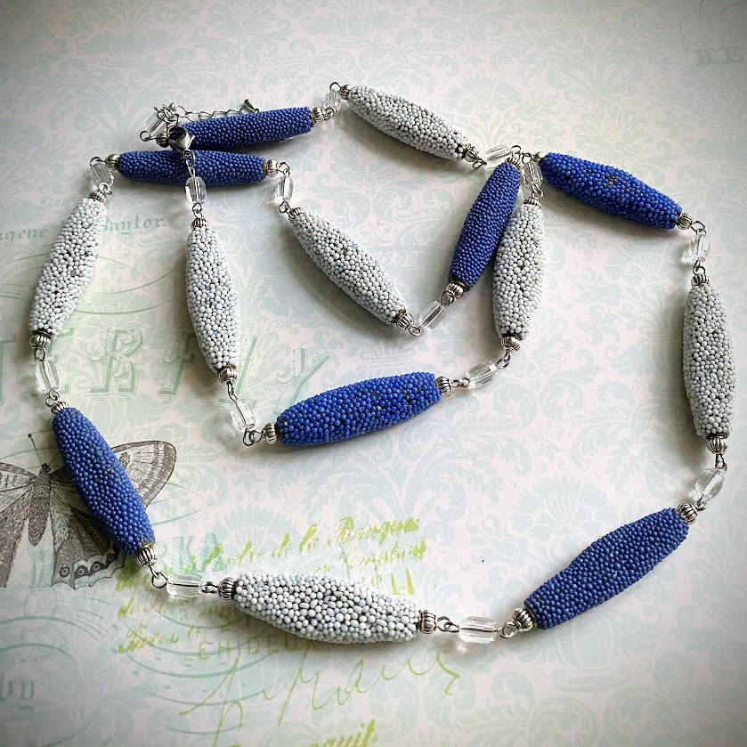 Nämä erikoiset helmet on ostettu Venetsiasta, kun taas kaulakoru on tehty käsin Suomessa. Koru on ainoa laatuaan.