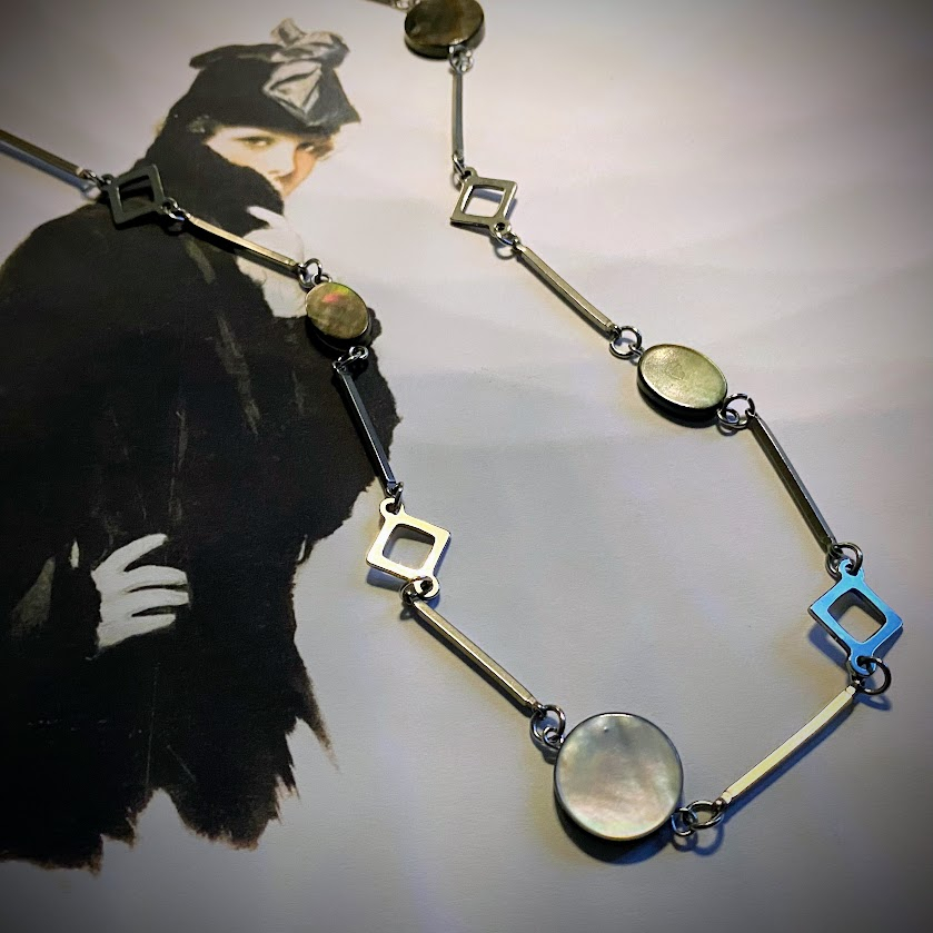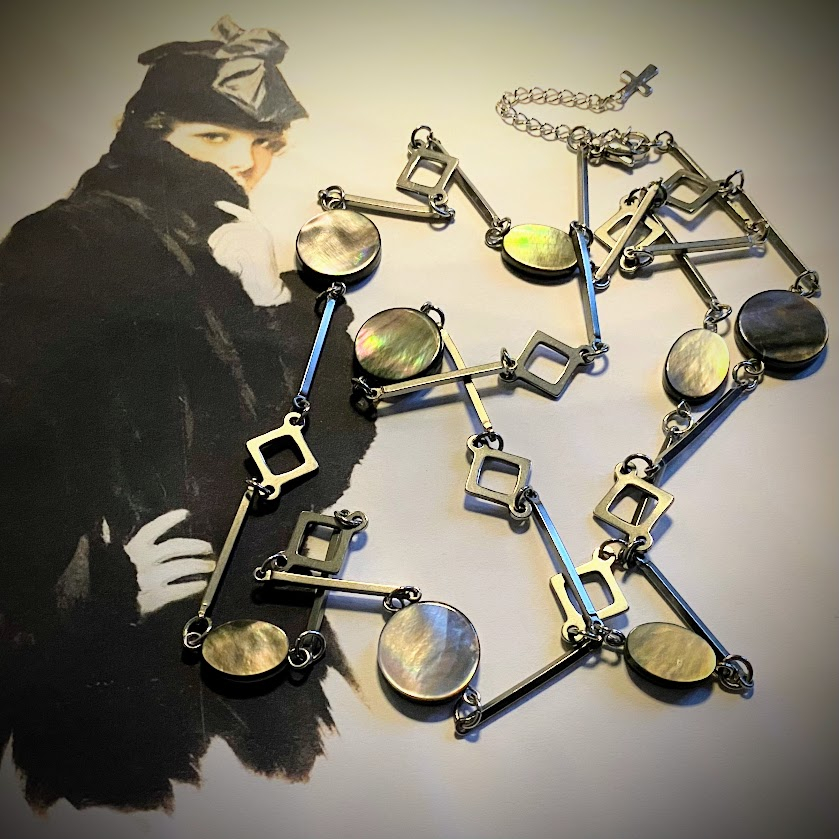 Selkeälinjainen, hienostuneesti hohteleva kaulakoru on tehty Tahitin mustan simpukan helmiäisestä. Koru on käsintehty Suomessa. Se on helppo yhdistää erivärisiin asuihin.