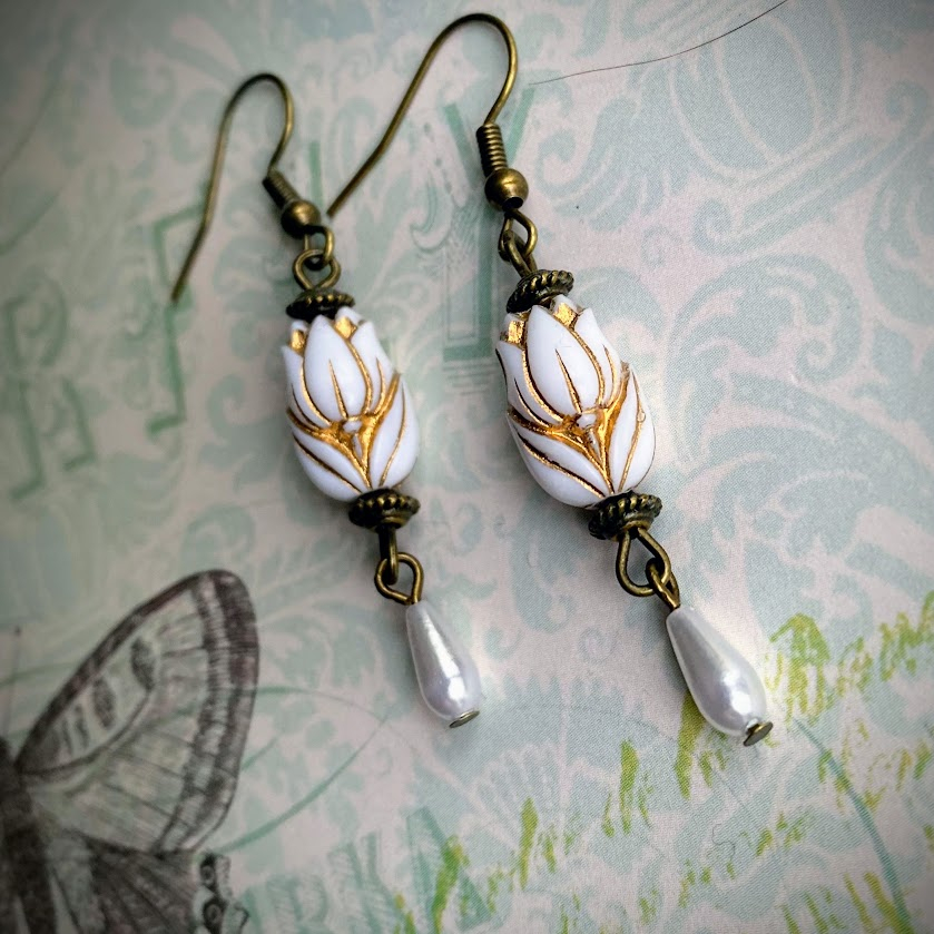 Kauniit, tulppaaniaiheiset korvakorut on viimeistelty pienellä helmipisaralla.