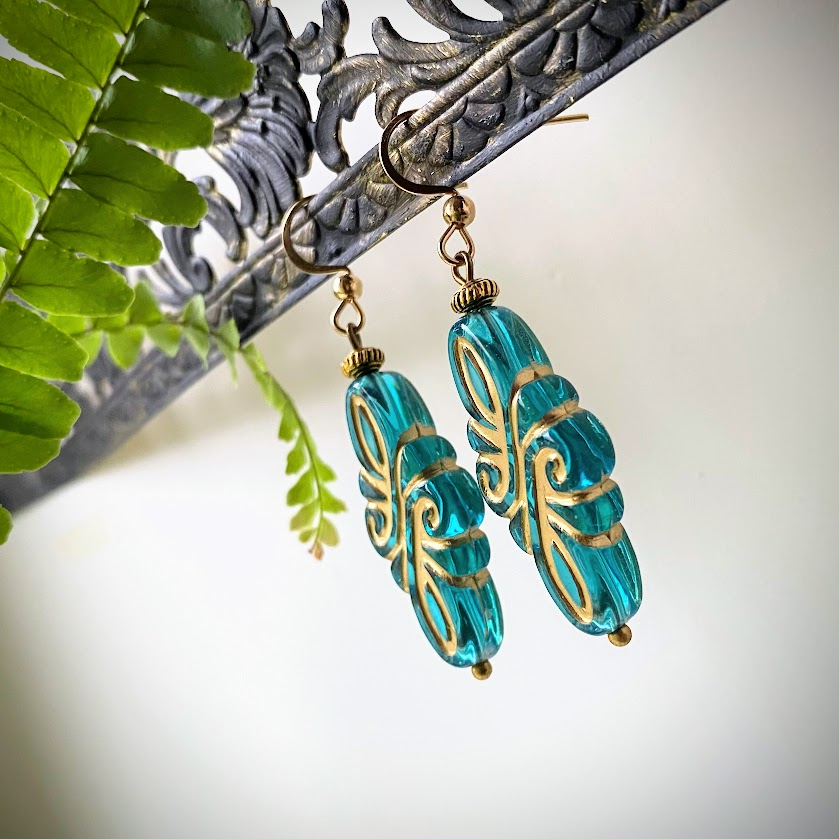 Kauniit turkoosit, kullanvärisin ornamentein viimeistellyt hartsihelmet heijastelevat valoa viehättävällä tavalla.