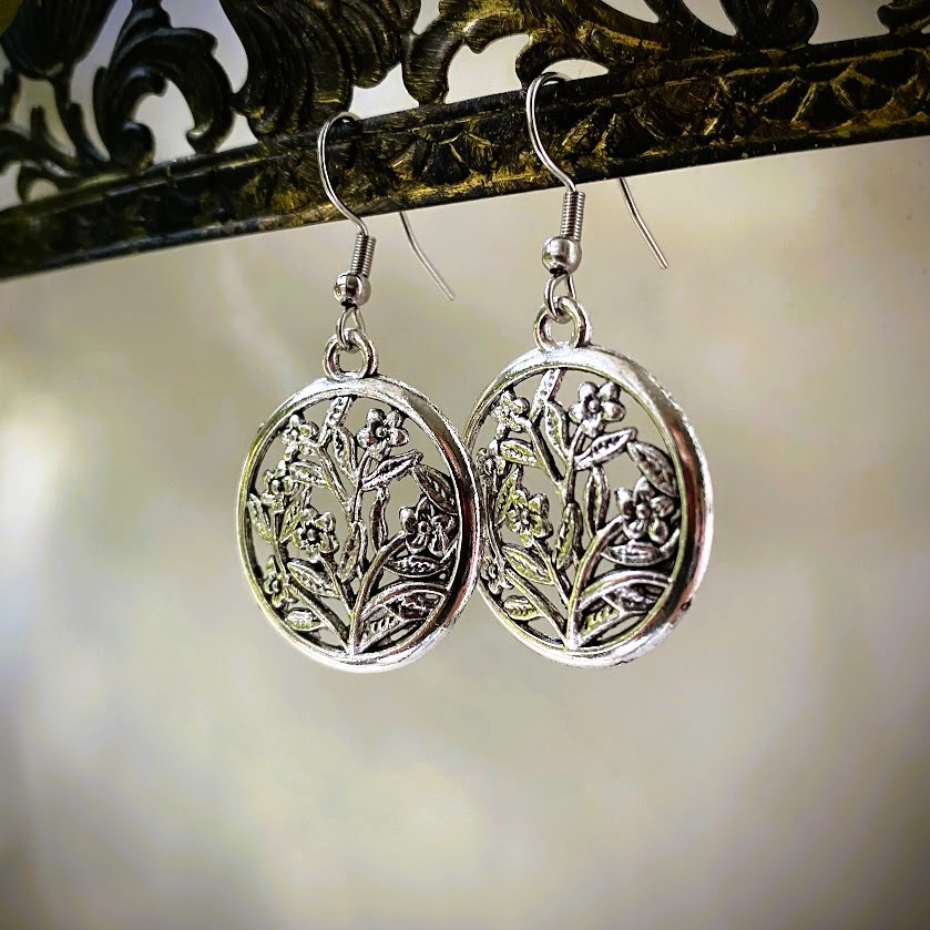 Nämä kauniit, kukka-aiheiset on tehty antiikkihopeanvärisestä korumetallista.