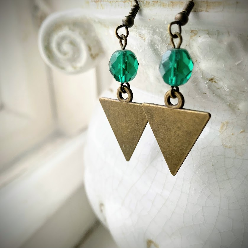 Näitä antiikkimessinginvärisiä korvakoruja koristavat smaragdinvihreät lasihelmet ovat tsekkiläistä käsityötä.
