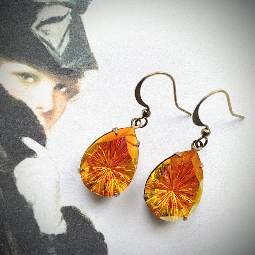 Kauniit lasipisarat on hiottu säteittäin ja ne heijastelevat liekkien sävyissä.