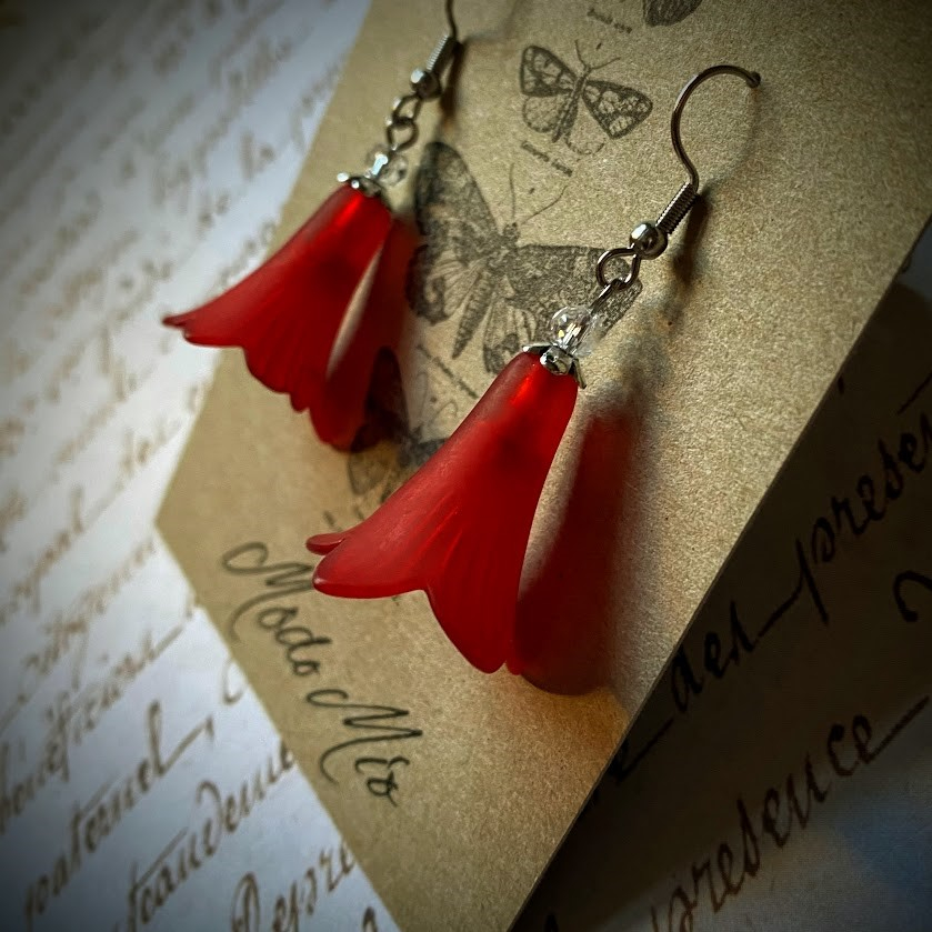 Kauniiisti muotoillut kellokukat ovat väriltään mansikanpunaiset. Korvakorut on viimeistelty pienillä, kirkkailla lasihelmillä ja viehättävillä metallidetaljeilla.