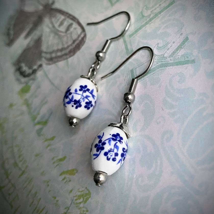 Kauniit, keraamiset helmet on koristettu sinisillä kukilla. Pikkuiset korvakorut on varustettu teräskoukuilla.