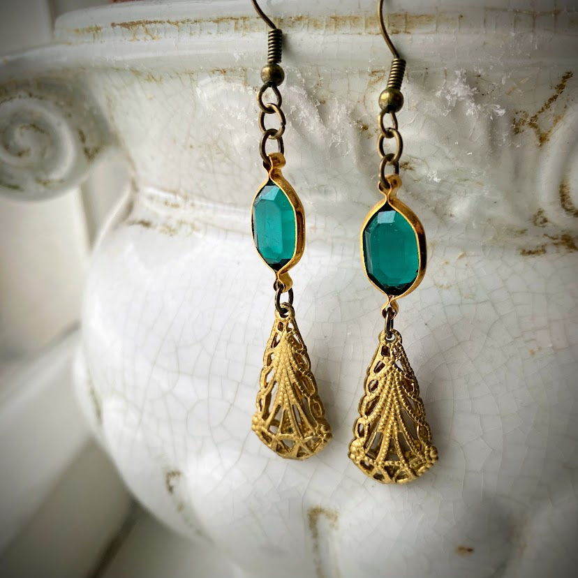 Vintagehenkiset, messinginväriset korvakorut on viimeistelty smaragdinvihreillä detaljeilla.